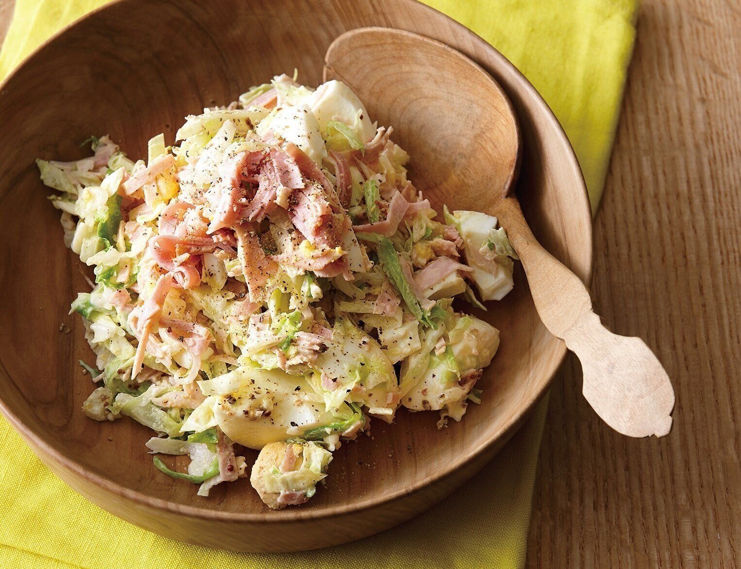 キャベツは細切りにし、塩小さじ1/4を加えて混ぜ、しんなりするまでおき、水分を絞る。ゆで卵は2cm角に切り、ハムは細切りにする。ボウルにキャベツ、ゆで卵、ハム、マヨネーズ、レモンの絞り汁を合わせて混ぜ、黒こしょう少々をふる。