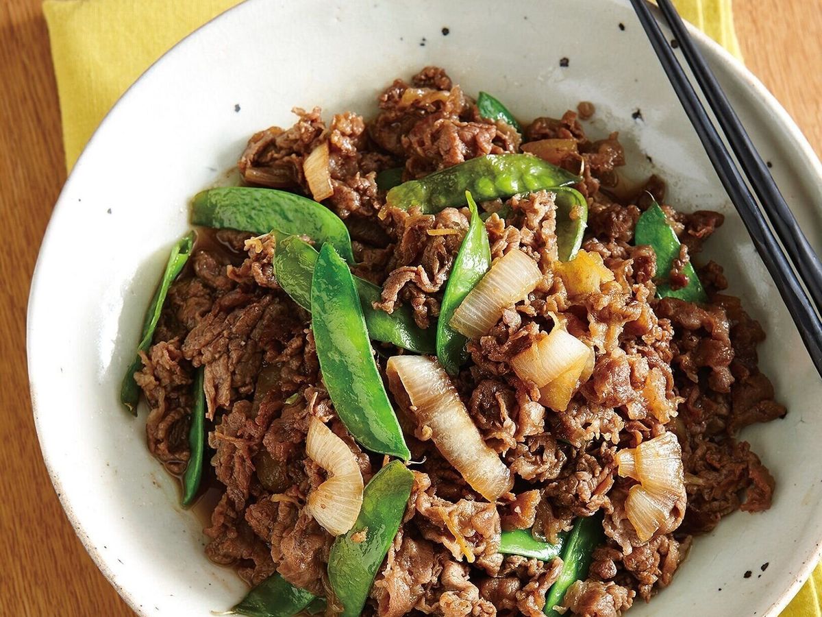 牛肉の色が変わったら[A]を加え、時々混ぜながら中火で3分ほど煮からめる。きぬさやを加え、さっと火を通す。好みで紅しょうがを添える。