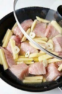 めかじきは1切れを3等分に切ってフライパンに入れ、塩小さじ1をまぶし、5分ほどおく。じゃがいもは、皮をむいて拍子木切りにしてさっと水にさらす。にんにくは薄切りにする。