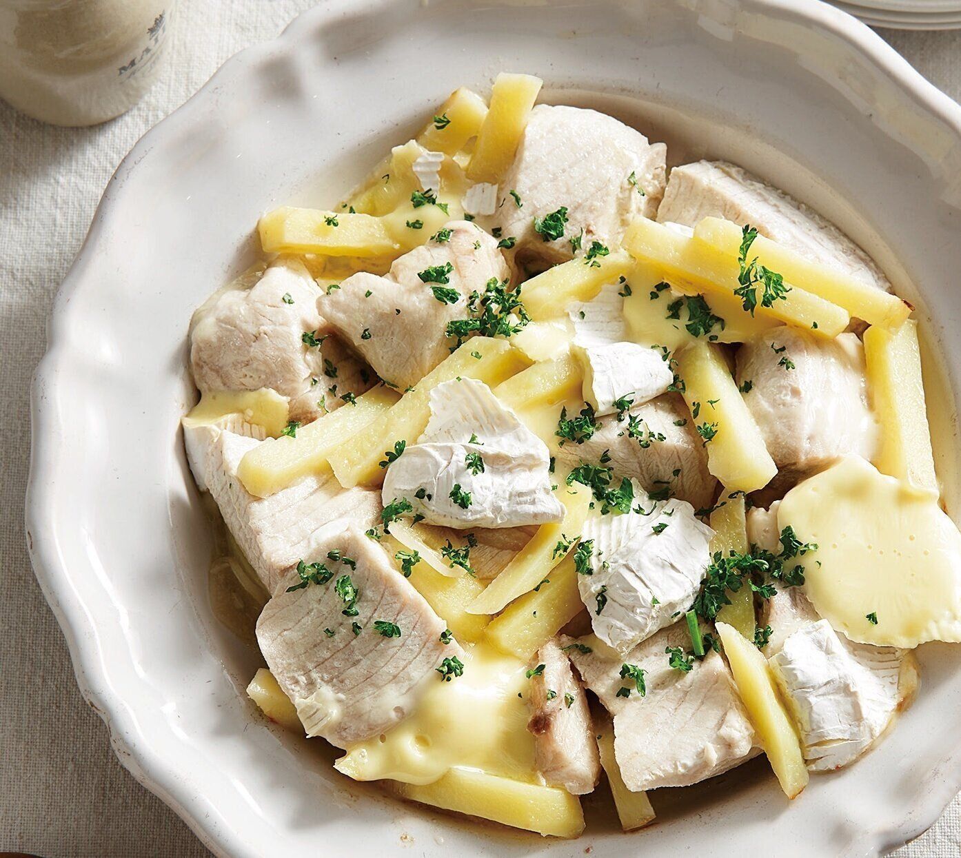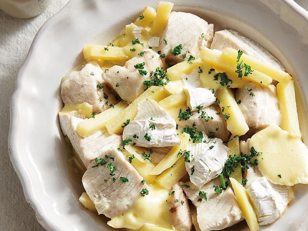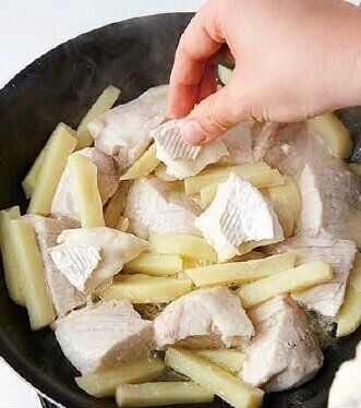 魚とじゃがいもに火が通ったら、カマンベールチーズをのせて溶かす。チーズの塩けとうまみでがっつりした食べ応えに。