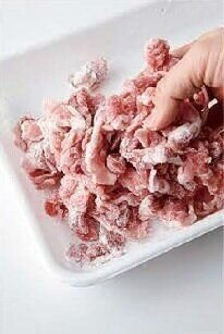 豚肉は食べやすい大きさに切り、[A]をまぶす(写真)。白菜は軸と葉の部分に分け、軸は一口大に切り、葉は3cm四方くらいのざく切りにする。たけのこは縦に薄切りにして、湯でさっとゆでて独特のにおいを抜く。しいたけは石づきを取って薄切りにする。