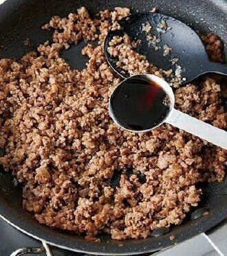 ひき肉の色が変わったら、砂糖としょうゆで味つけ。調味料は2つだけで同量ずつだから作りやすい。