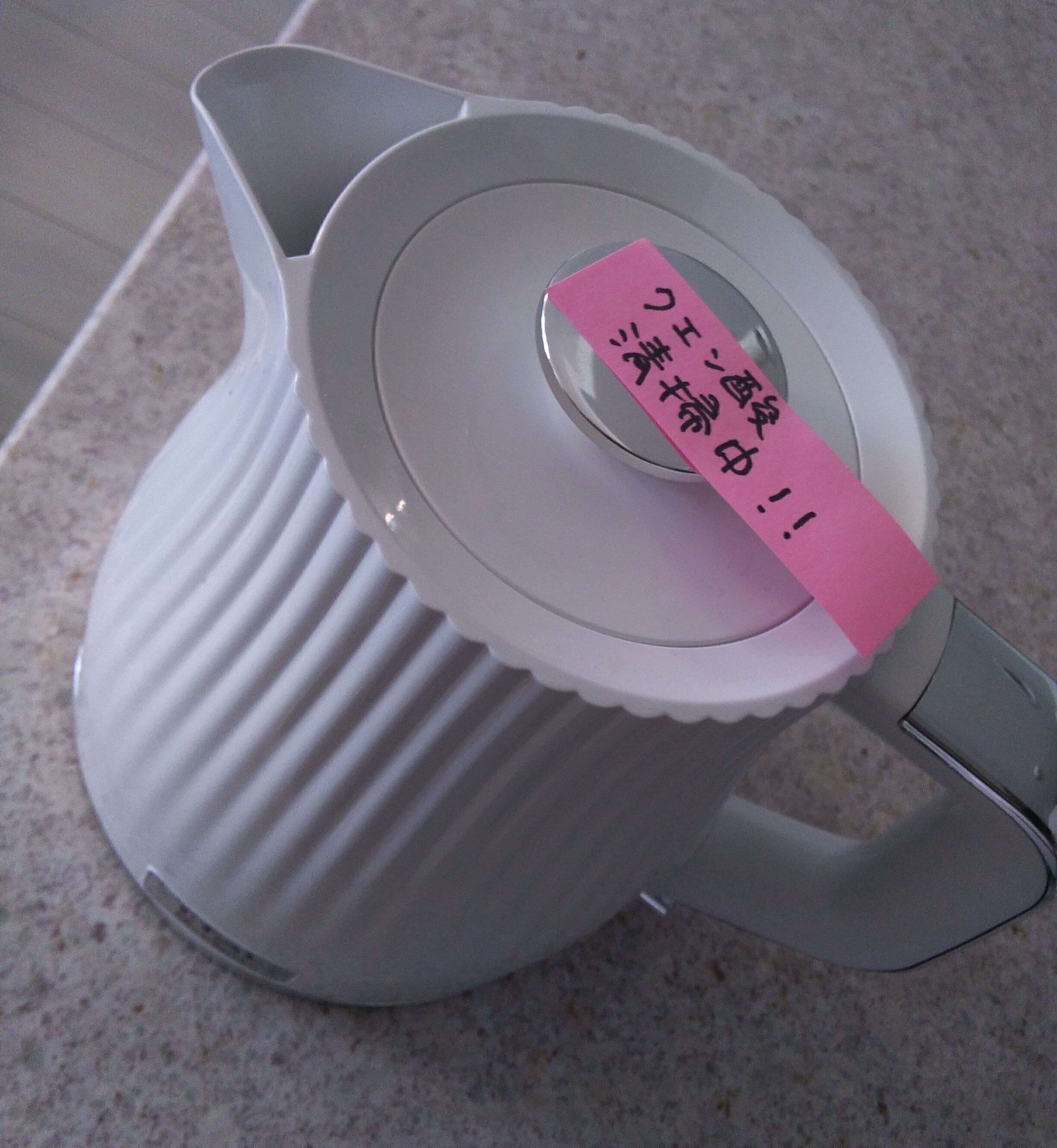 【2】1時間置きます。放置中は間違って中のお湯を使ったり捨てたりしないよう、「清掃中」の付箋を貼っておきましょう。