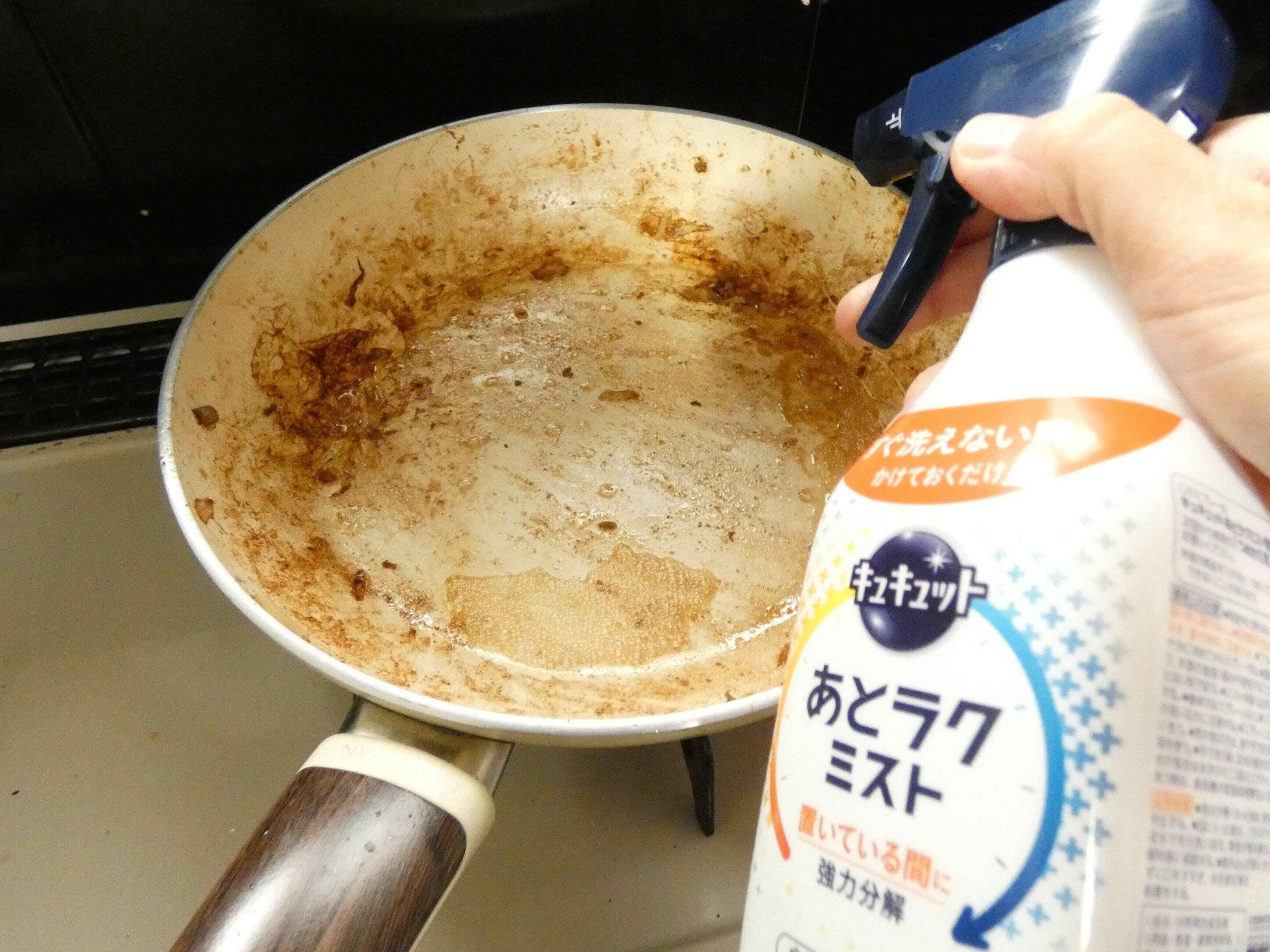 こんなに簡単に落とせるなら、急いで食器洗いをしなくていいかも?夕飯準備に使ったフライパンやヘラなどもシュッとスプレーし、ゆっくりごはんを食べてから洗い物をすると、さっと汚れが落ちるので時短にもなります。