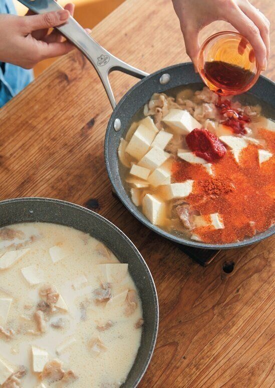 豚肉と豆腐を煮たら2つに分け、味つけを変えるだけ。手軽に紅白2種類の麻婆豆腐ができる!