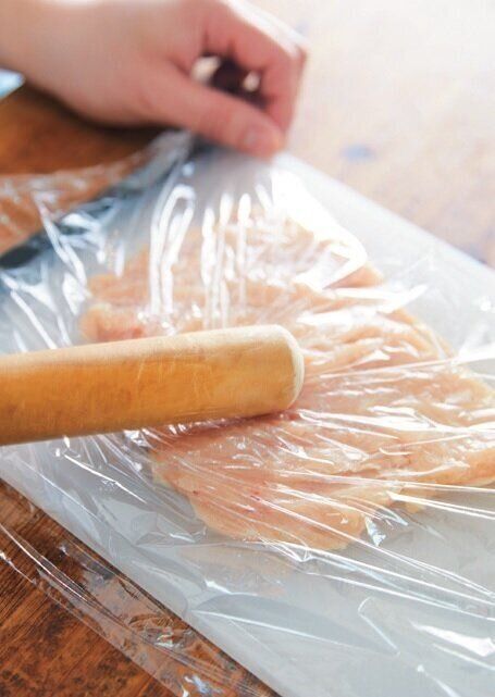 (1)まな板に鶏肉をのせてラップを掛け、めん棒でたたいて厚さ5mmほどにする。ボウルに[A]と鶏肉を入れて、30分以上漬ける。