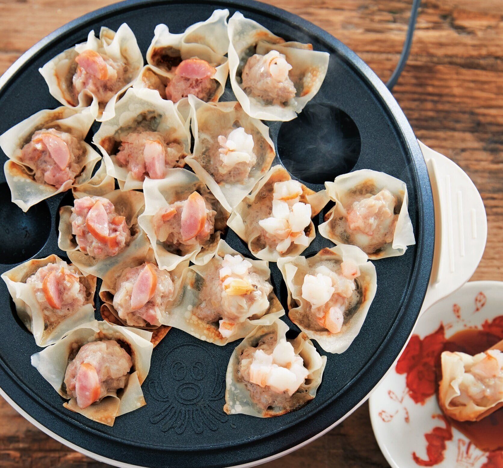 (2)たこ焼き器にごま油を塗り、シュウマイの皮を敷く。(1)をそれぞれ大さじ1くらいずつしぼり入れて、ソーセージとシーフードミックスをトッピングする。