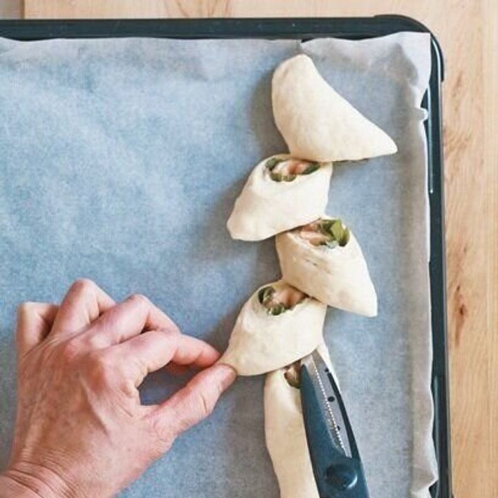 (12)とじ目を下にして、オーブンシートを敷いた天板に並べる。はさみで5カ所切り込みを入れながら生地を左右交互に広げ(d)、水にぬらして固く絞ったふきんを掛けて30分やすませる。