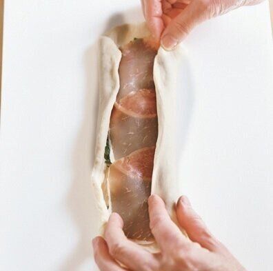 (9)めん棒で生地を10×25cm大にのばして、中心に青じそ、生ハムをのせる。
