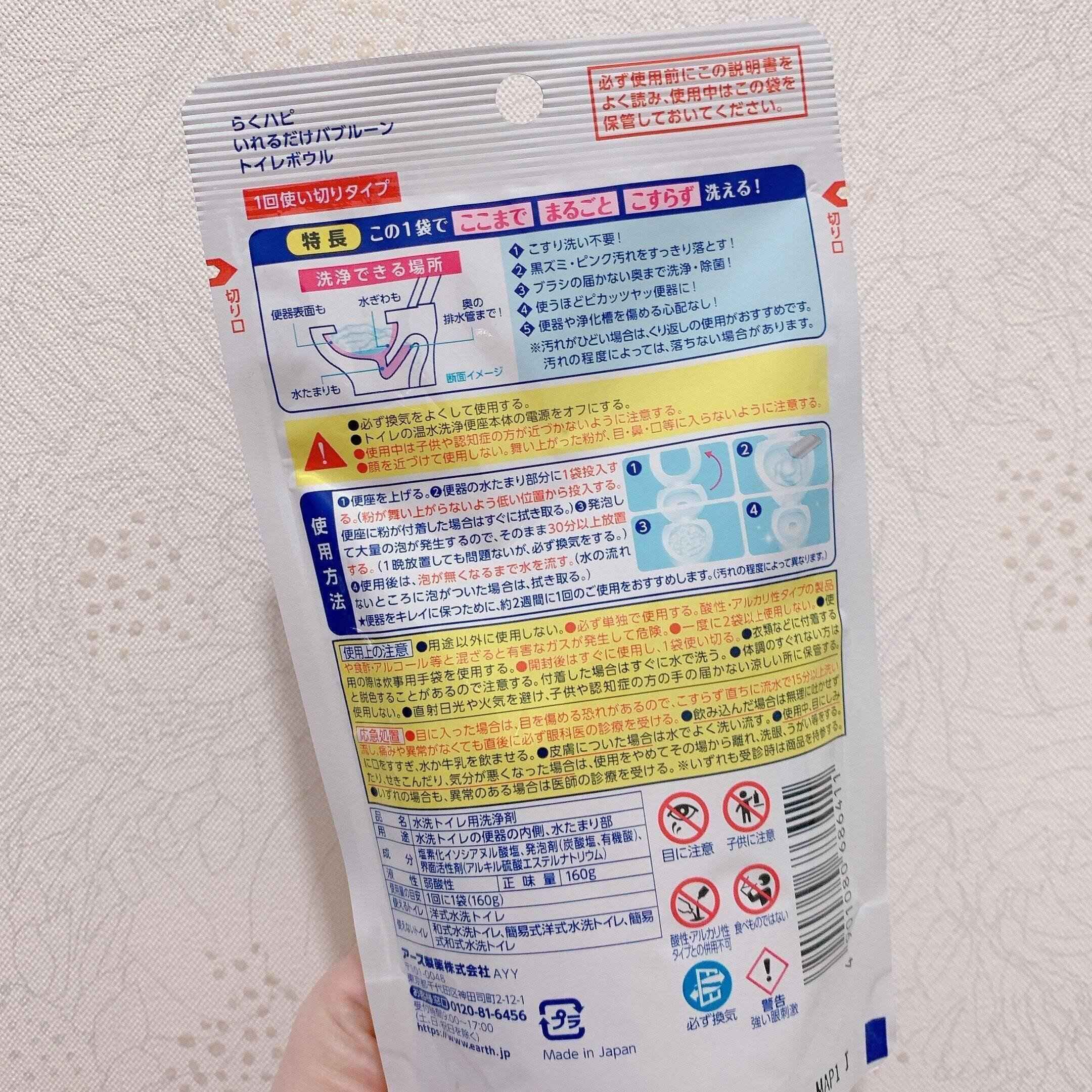 使い方は、便器の水の中に入れるだけなんですが、入れる際は粉が舞って吸い込んでしまわないように、水に近づけて静かに入れてください。換気も必ずしましょう。