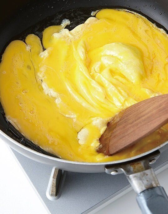 フライパンにサラダ油大さじ2を中火で熱し、卵液を流し入れる。まわりが少し固まってきたら大きく混ぜ、半熟状になったら取り出す。