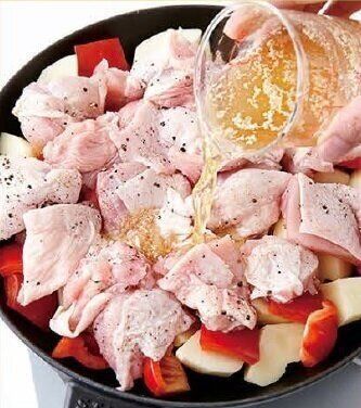 鶏肉は大きめの一口大に切って塩小さじ1、黒こしょう少々をふり、(1)の上にのせる。