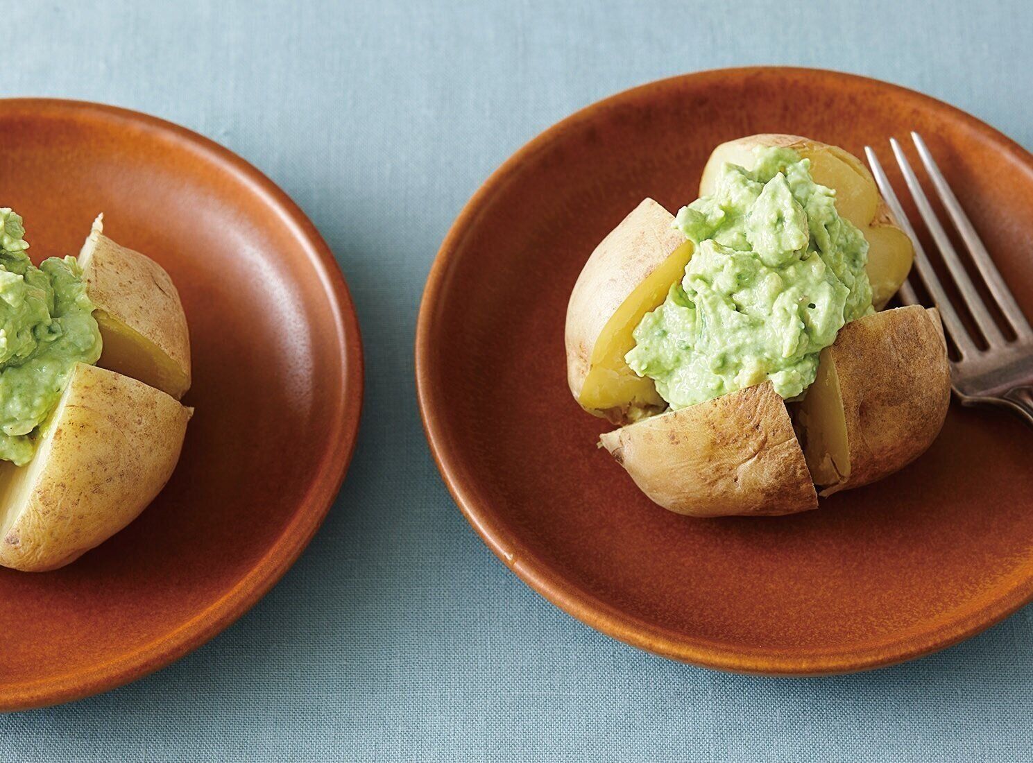 じゃがいもは1個ずつラップで包んで電子レンジに入れ、5分加熱する。上下を返してさらに4分ほど加熱する。アボカドは種、皮を除いて、ボウルに入れてフォークでつぶし、[A]を混ぜる。じゃがいもに十字に切り込みを入れ、アボカドマヨをのせる。