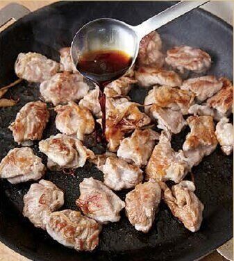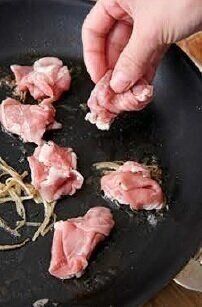 フライパンにごま油を入れて中火で熱し、しょうがを入れる。香りが立ったら豚肉を丸めて入れ、両面に焼き目をつけ、ポン酢しょうゆを加える。