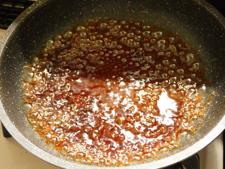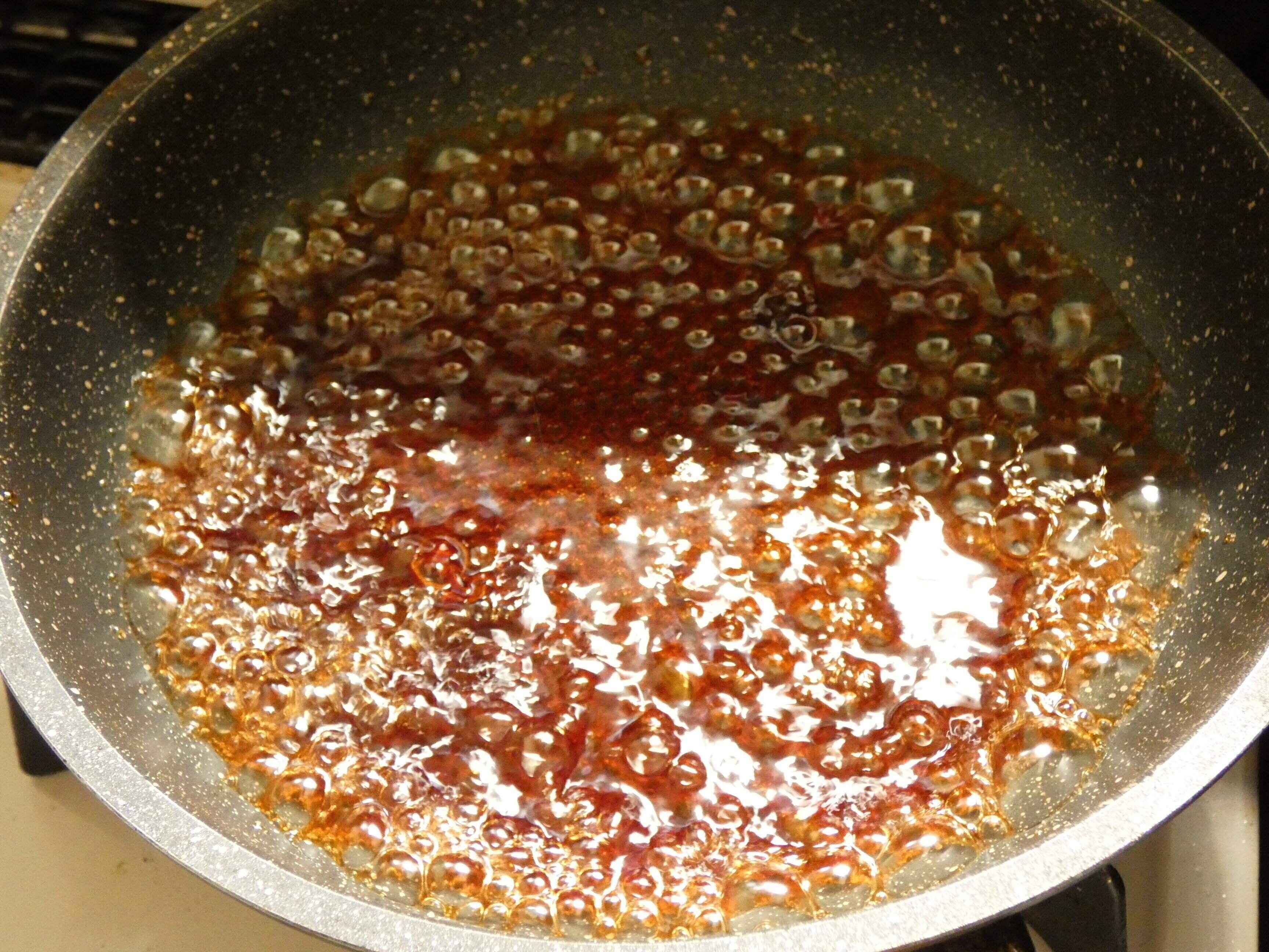 3.しょう油、酢、砂糖、唐辛子を小鍋に入れて、沸騰したら火を止めてごま油をたらします。