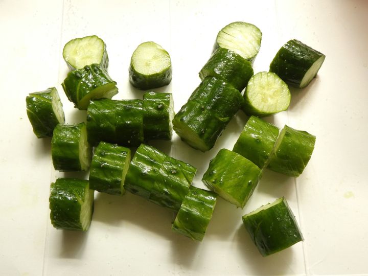 2.キュウリを板ずりし、蛇腹に切ったら2cm位の長さに切ります。