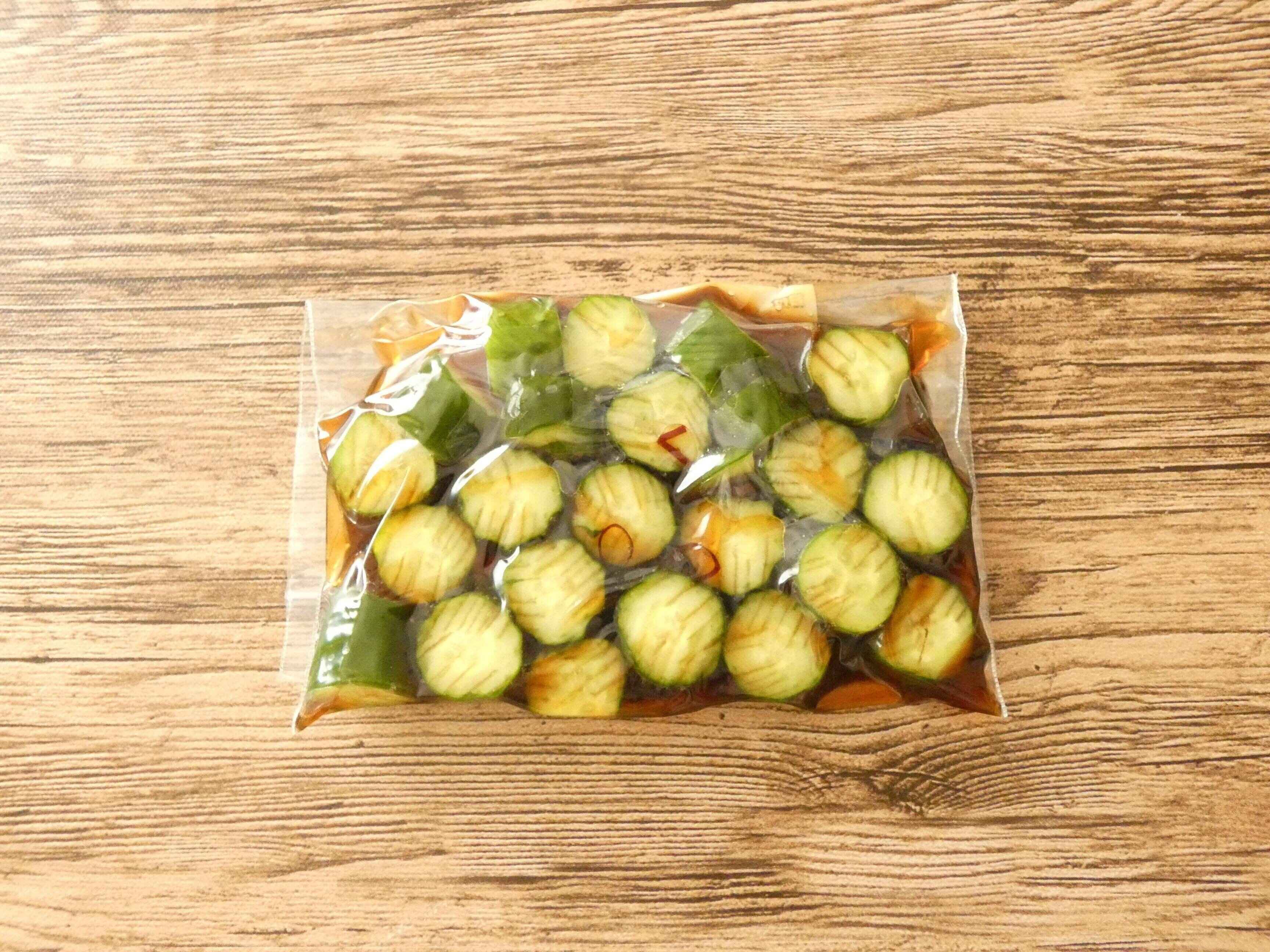 唐辛子の量はお好みで調節してくさい。ジッパーつき袋を使うと、少ない調味料でもしっかり漬けることができます。
