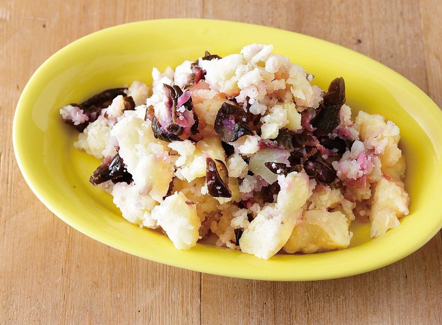 じゃがいもは皮をむいて3cm角に切り、耐熱皿に入れてラップを掛け、電子レンジで約4分加熱する。温かいうちに粗くつぶす。しば漬け、[A]を加えて混ぜる。
