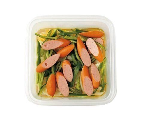 野菜を広げて入れ、ソーセージをのせる。