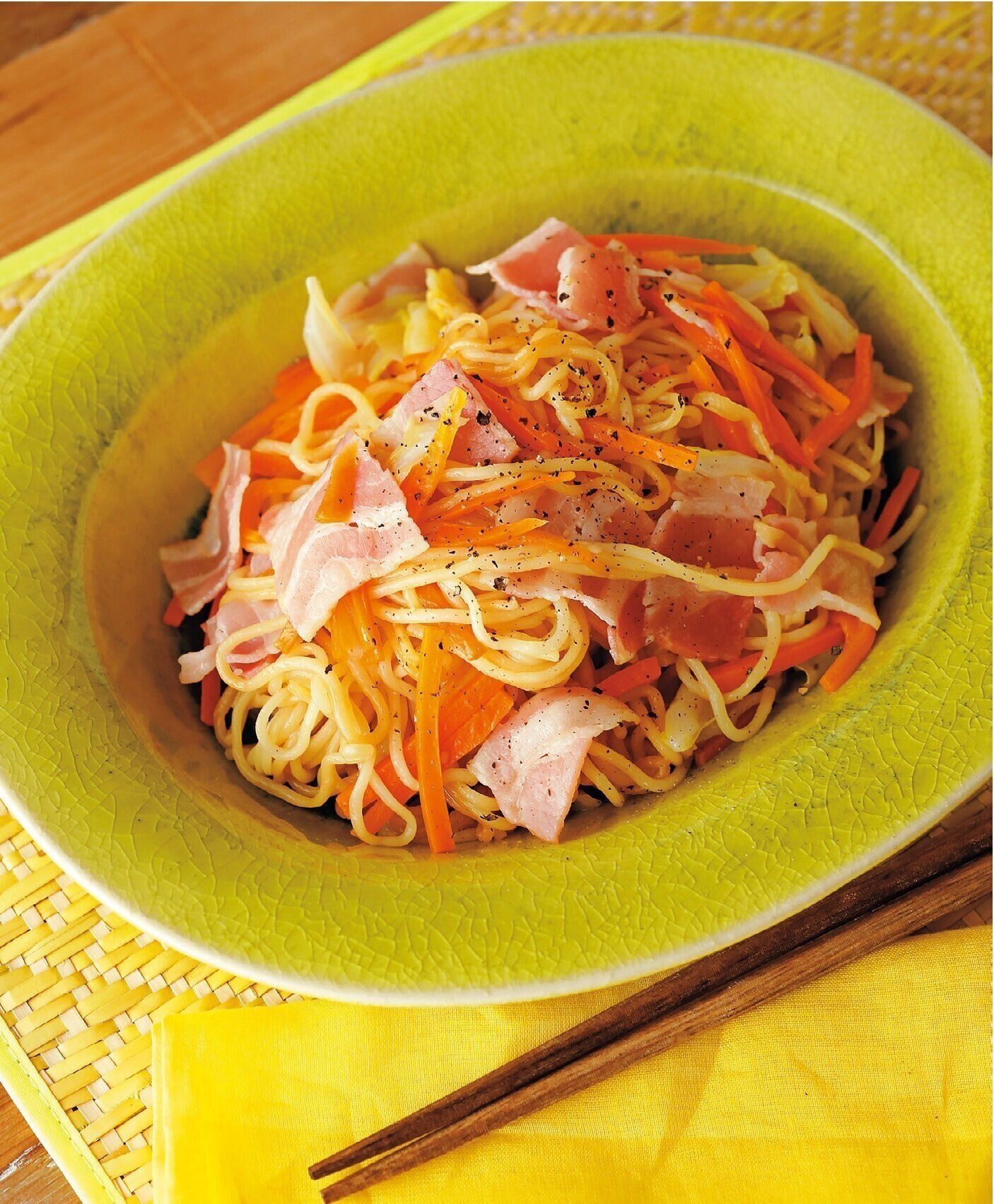 麺、[A]を入れる。にんじんとキャベツを入れ、ベーコンをのせ、[B]を入れる。ふたをして冷凍室に入れる。