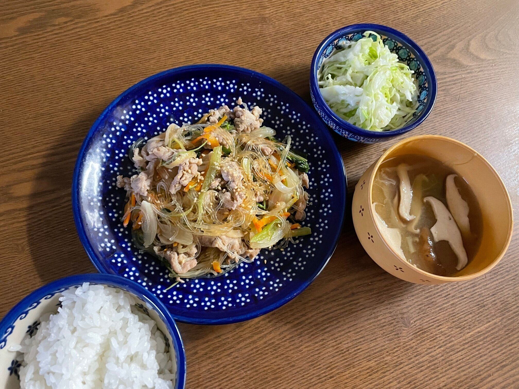 木曜日は、焼き肉のタレを使ったチャプチェ風の炒め物とキャベツのサラダ。ざるに入れた千切りキャベツに熱湯を回しかけてしんなりしたら、塩麹とごま油で味つけしてサラダは完成。