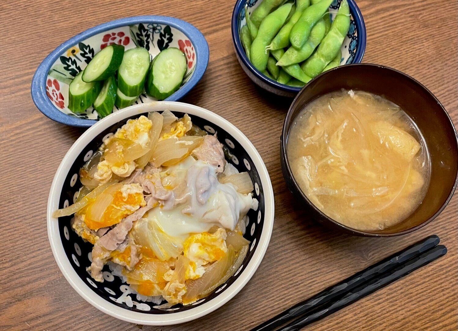 金曜日は、親子丼とぬか漬け、枝豆です。冷凍枝豆がまた登場。夏のあと一品に使いやすいですね。