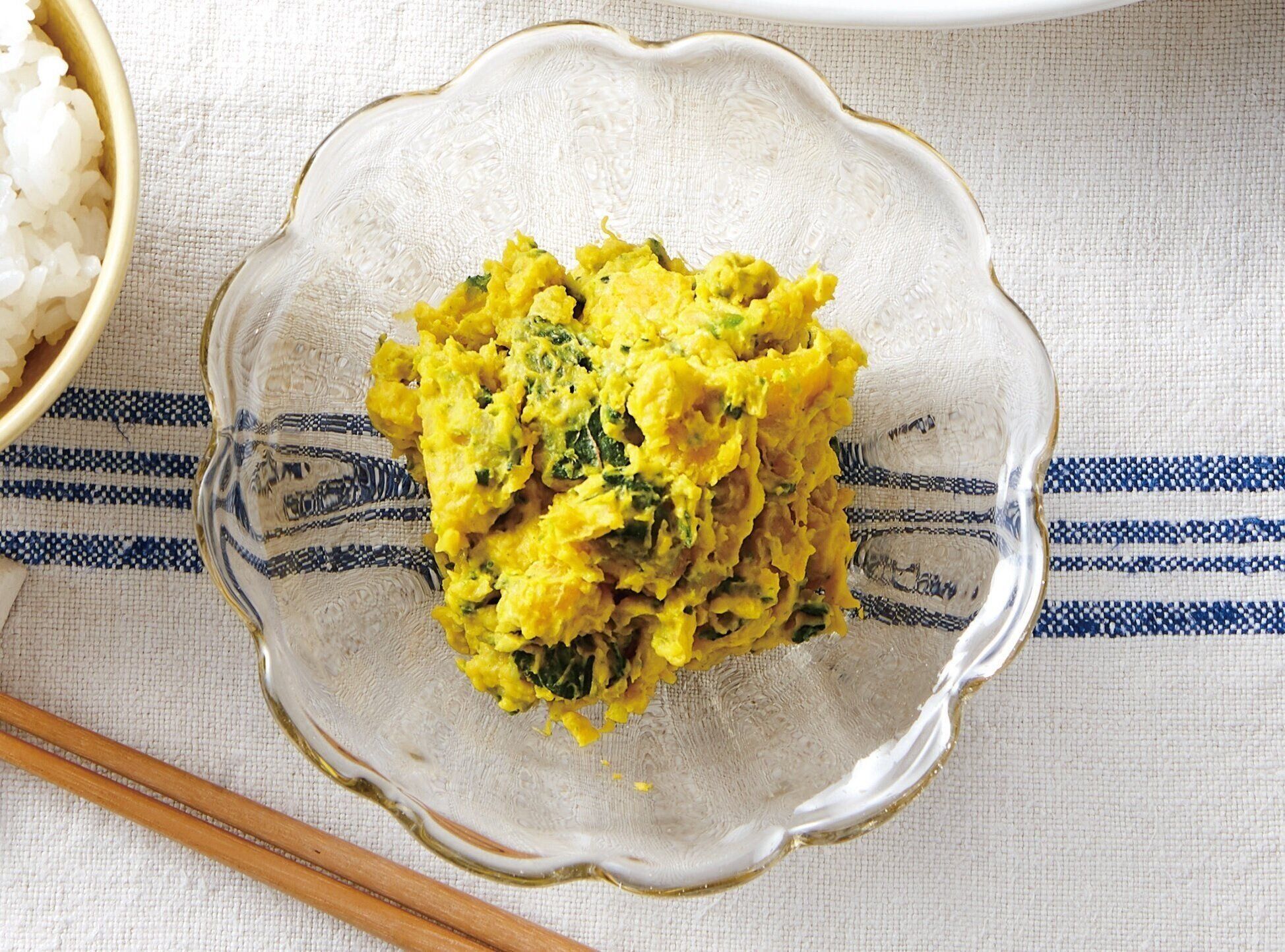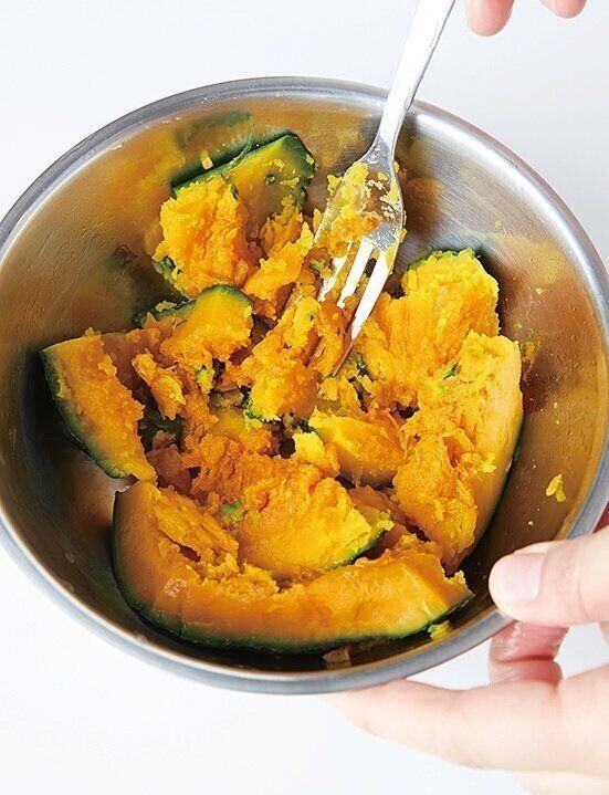 (1)のかぼちゃをボウルに入れ、フォークなどで粗くつぶし、粗熱が取れたら[A]を加えて混ぜる。