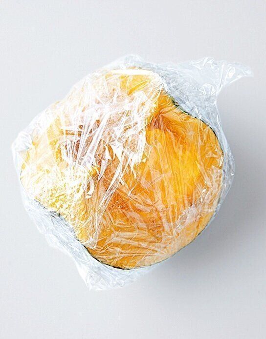 かぼちゃは、わたと種を除いたら、全体をラップで包む。電子レンジで5分加熱し、上下を返してさらに3分加熱する。電子レンジから出したら、ラップで包んだまま5分ほどおいて余熱で火を通す。