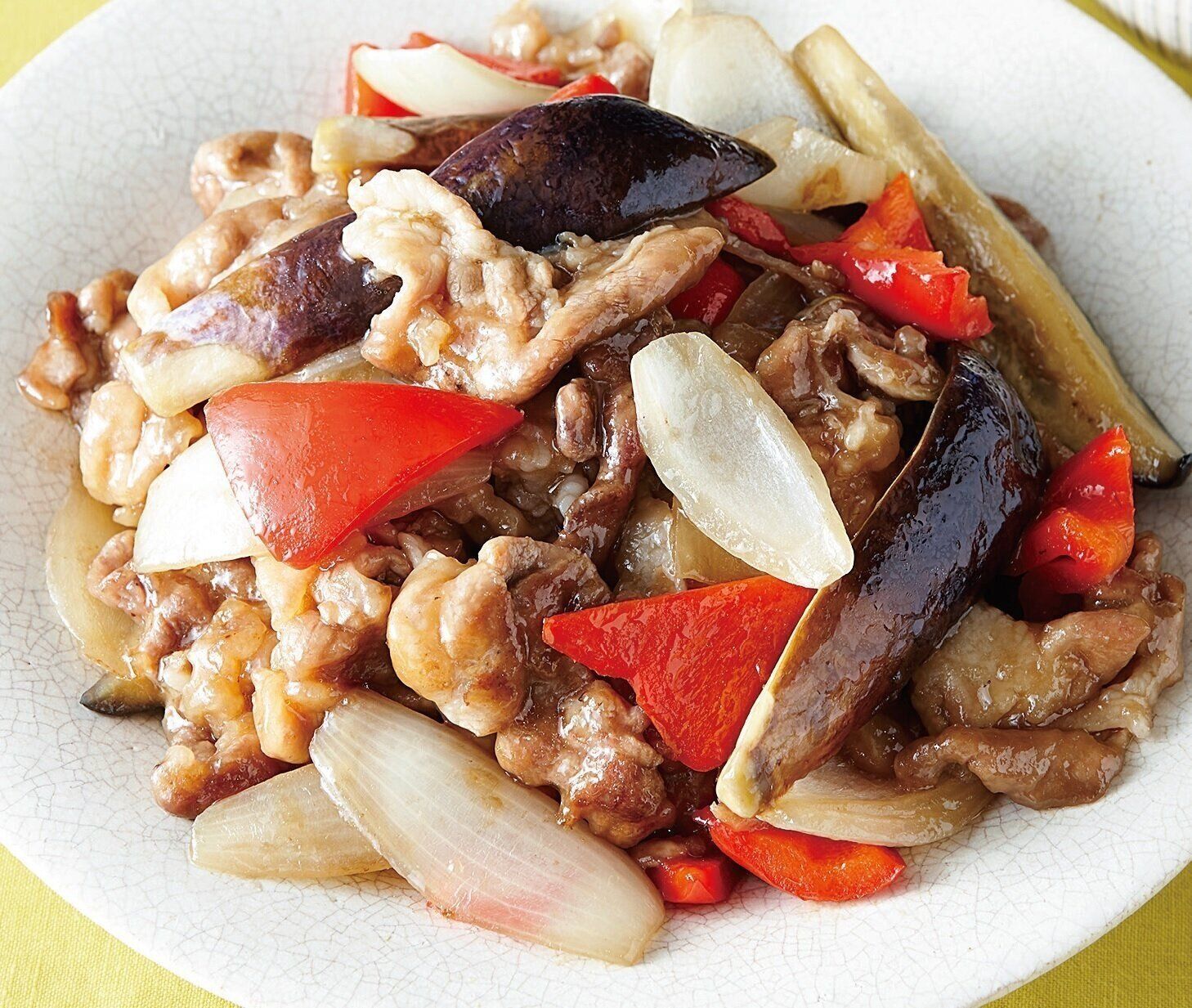 フライパンを熱し、サラダ油を入れて(1)の豚肉を片栗粉が残らないよう、しっかりからめてすべて一緒に入れ、強めの中火で5分ほど炒める。肉に火が通ったら、パプリカ、玉ねぎ、水けをきったなすを加え、さらに1分ほど炒める。