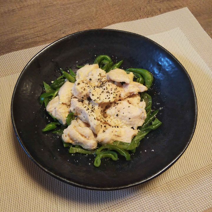 4:お皿にピーマン、鶏むね肉の順に並べて、ふんわりラップをかけて500Wで5分チンする