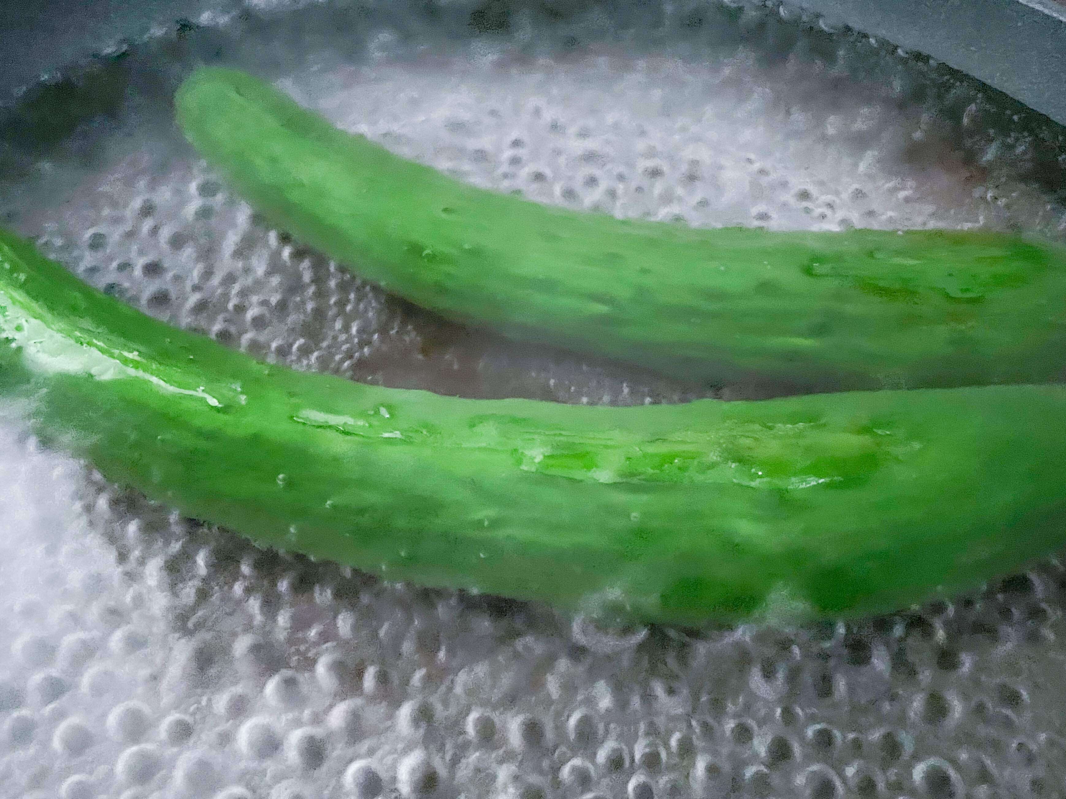ポイント…きゅうりがかぶるくらいのお湯でサッとゆでます。加熱しすぎると食感が悪くなってしまうので、ゆですぎないようにしましょう。