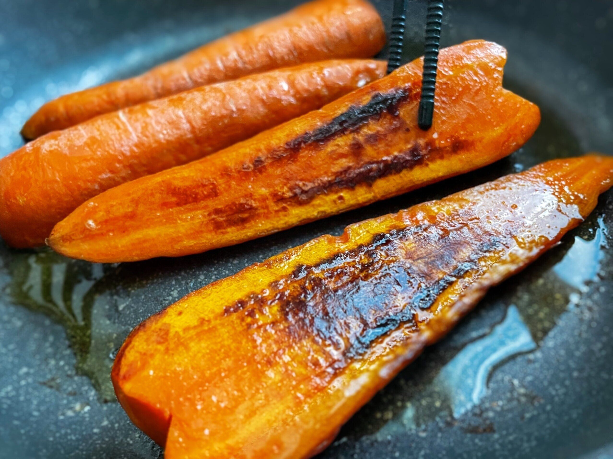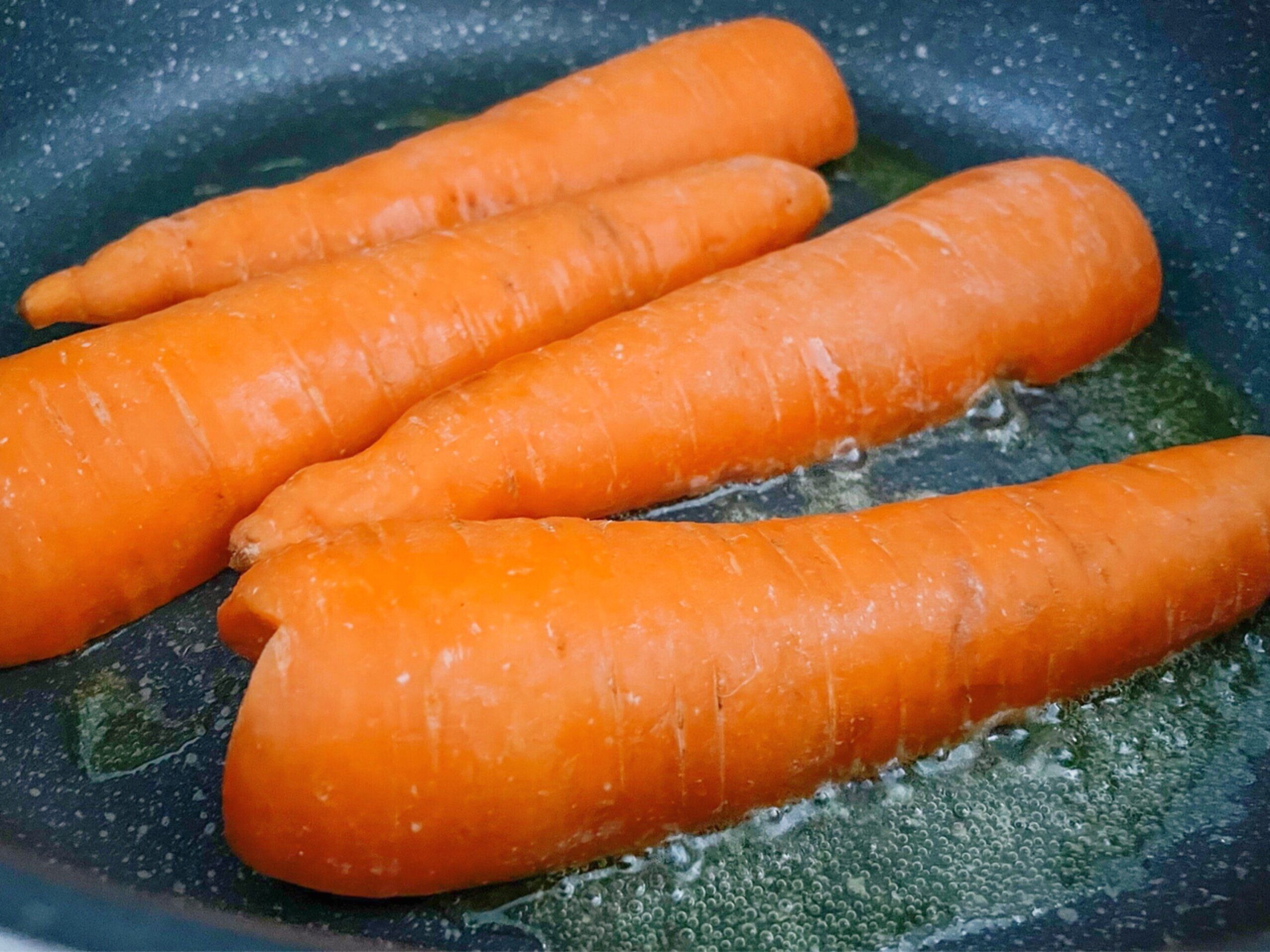 (4)バターが溶けたらにんじんの断面を下にしてならべ、弱めの中火で10分程度焼き色がつくまで焼く。