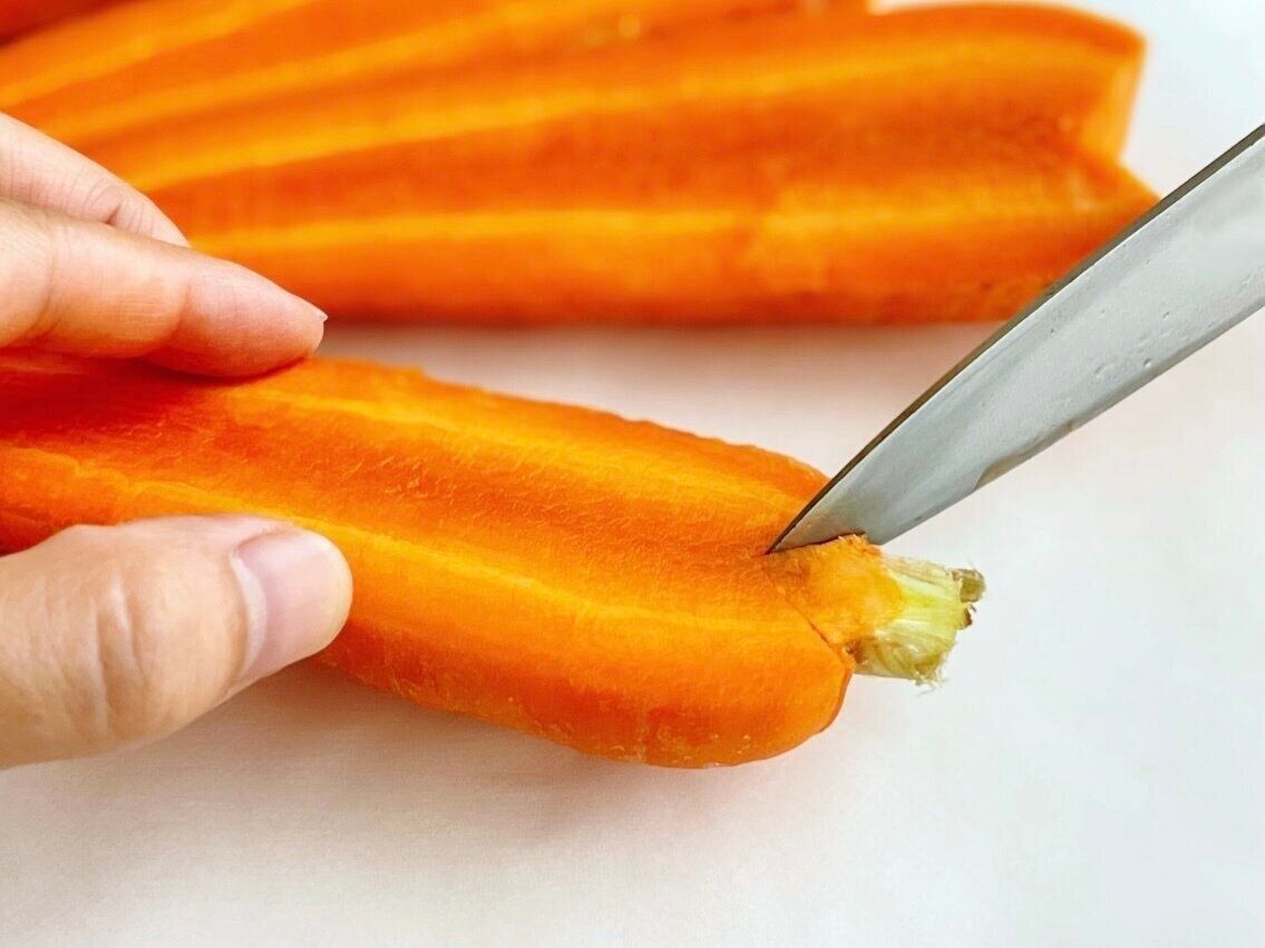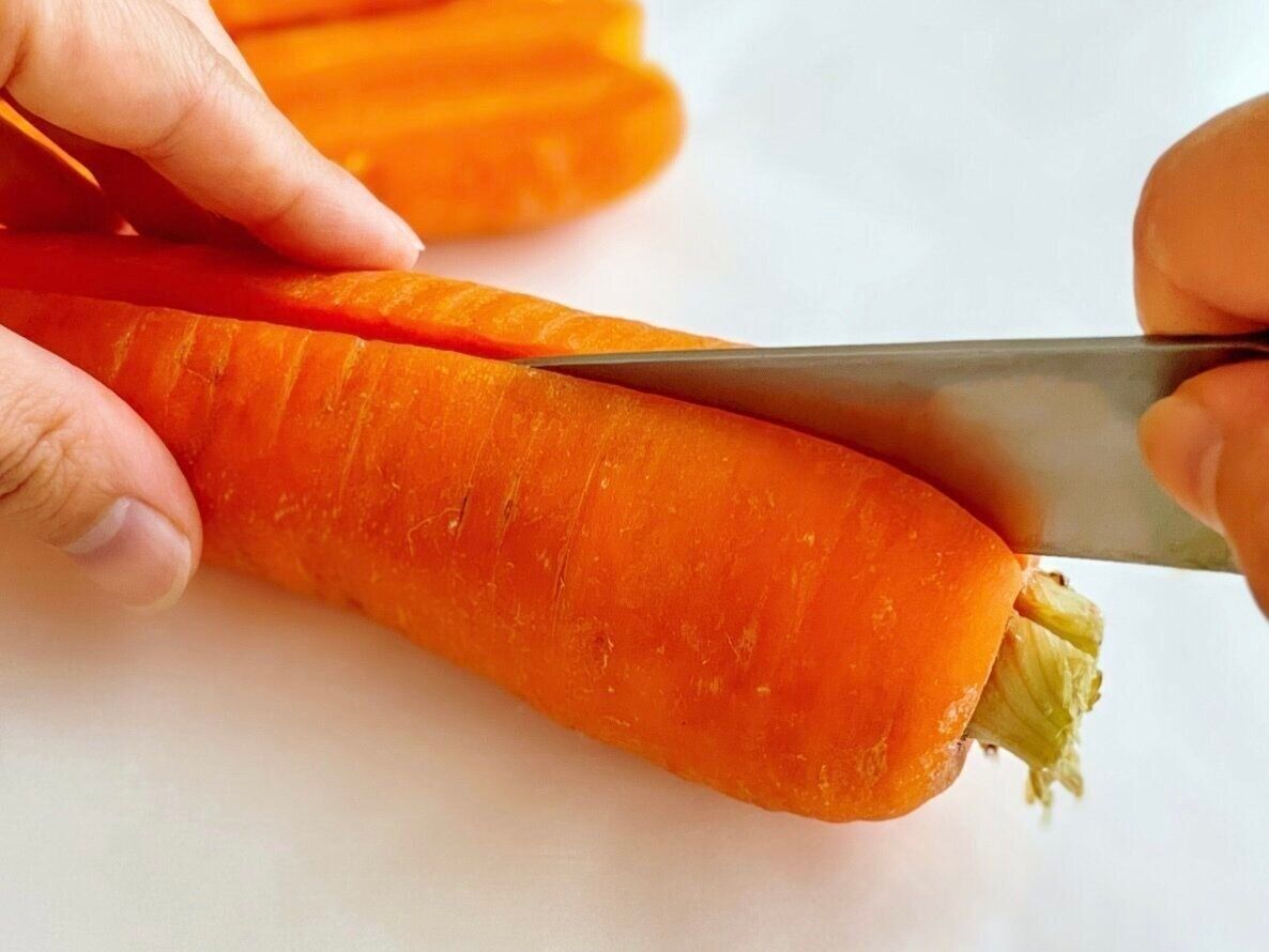 (1)にんじんは水洗いし、皮つきのままたて半分に切る。
