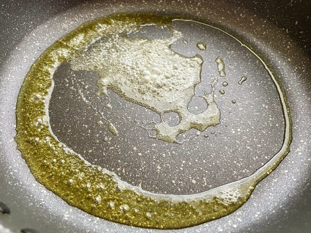 (3)フライパンにオリーブオイルとバターをいれて火にかける。