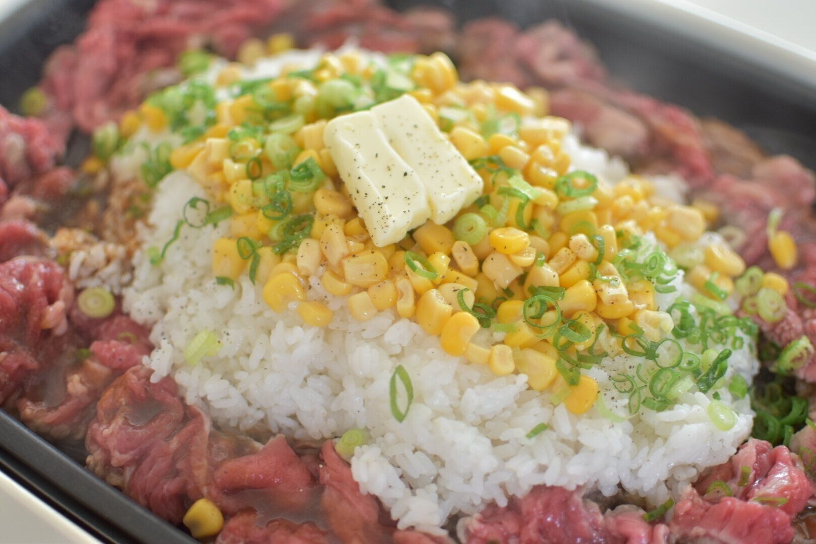 作り方は、オイスターソース、しょうゆ、塩、にんにく、酒を揉みこんだ牛肉をホットプレートに広げ、ご飯を中央に盛ります。コーンやねぎ、バターをトッピングしたら全体に焼肉のたれを回しかけて完成です。