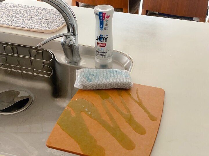 つかんで「キュッ!」で洗剤が出る「除菌ジョイ 逆さボトル」なら、スポンジやまな板の除菌*²も食器洗いのついでのひと手間で簡単!