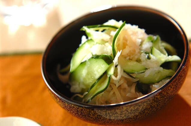 ガリに使われている甘酢の味つけでさっぱりと食べることができる、「ガリとキュウリのおろし和え」です。3種類の食感の違いも楽しむことができる料理で、箸休めやおつまみにもおすすめです。