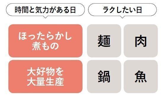 献立作りのポイントは、1週間のなかでの「時間と気力」がどれだけあるか考えて組み合わせること。「毎日ラクな料理だと似るから、時間と気力がある週末は子どもの好物をがんばって作ってます。その代わり翌週のべんとうや副菜に使えるように、多めに作って取りおきし、ラクします」。