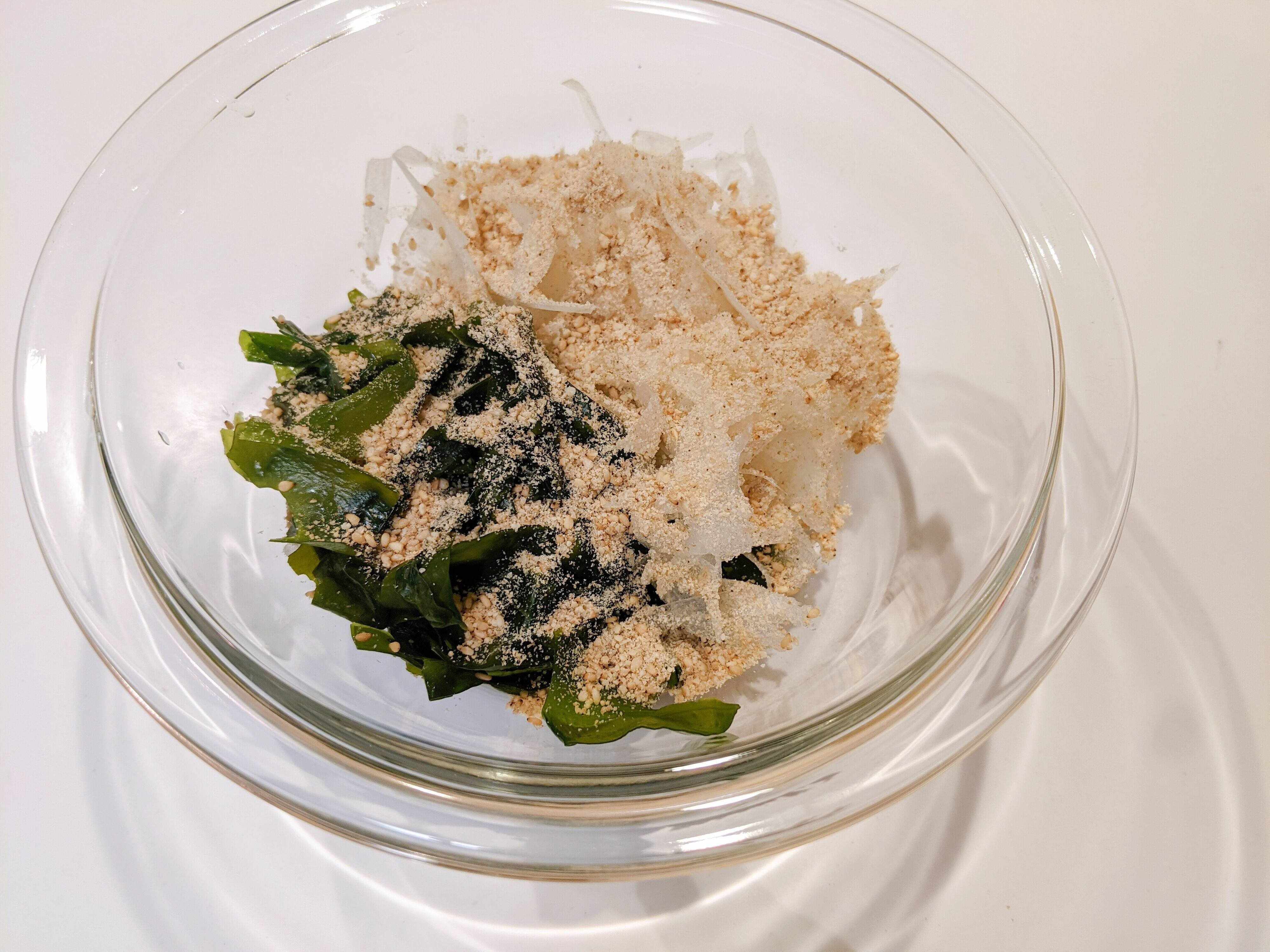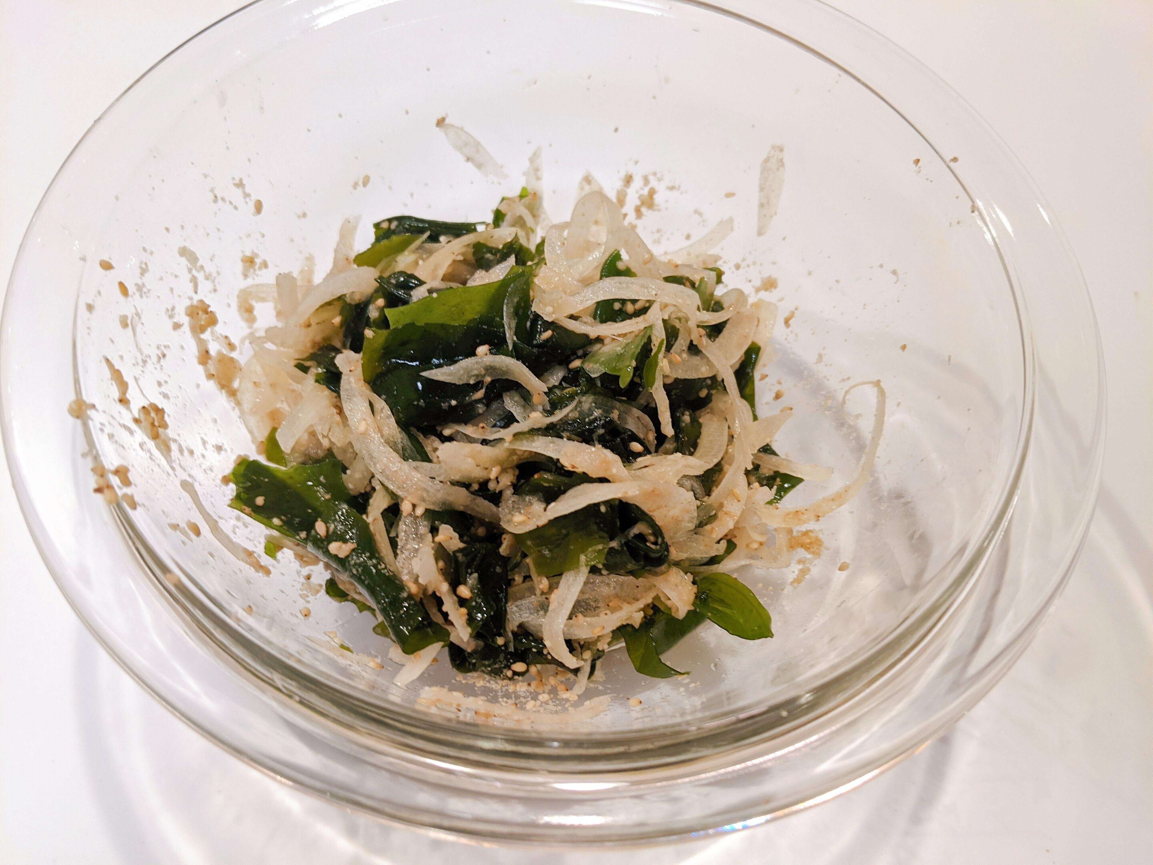 玉ねぎ、ワカメ、すりごま、めんつゆ