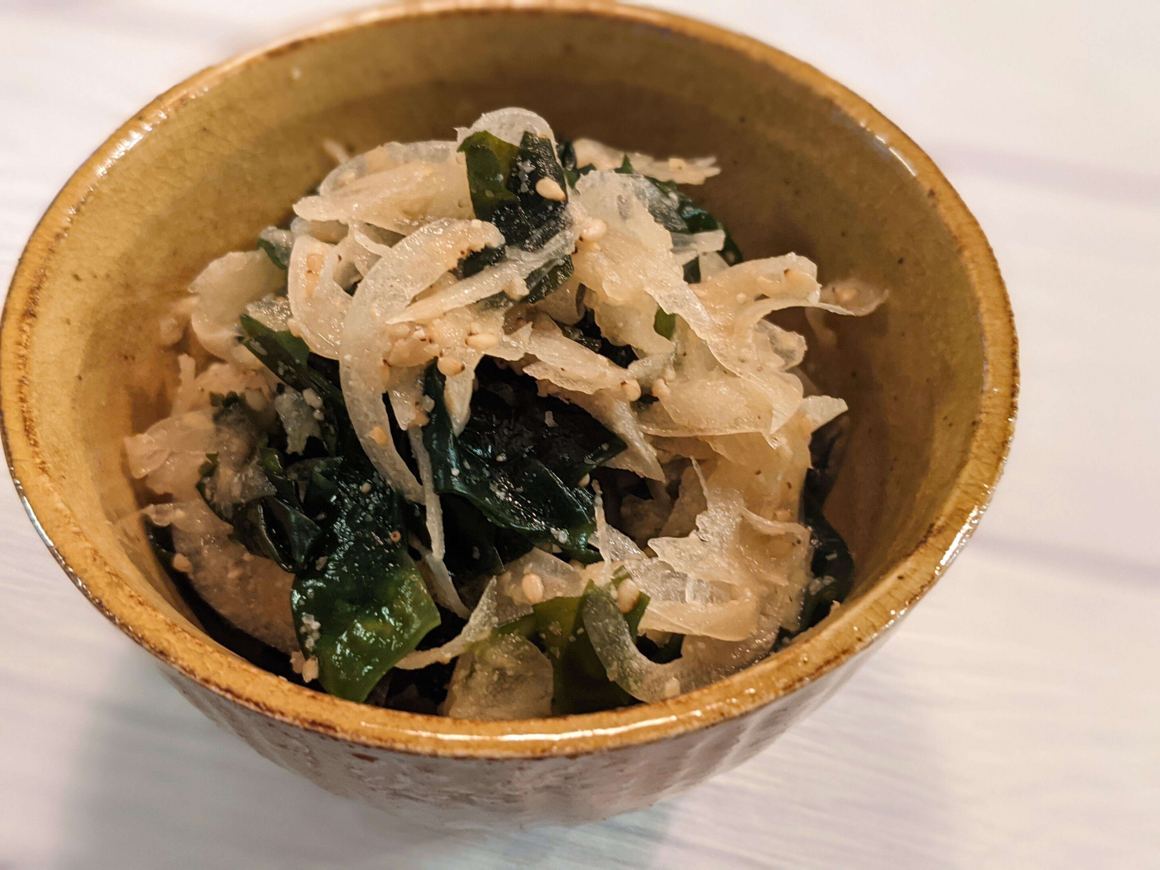 ワカメの歯ごたえと玉ねぎのシャキシャキ感が合わさり、さっぱりいただける一品です。