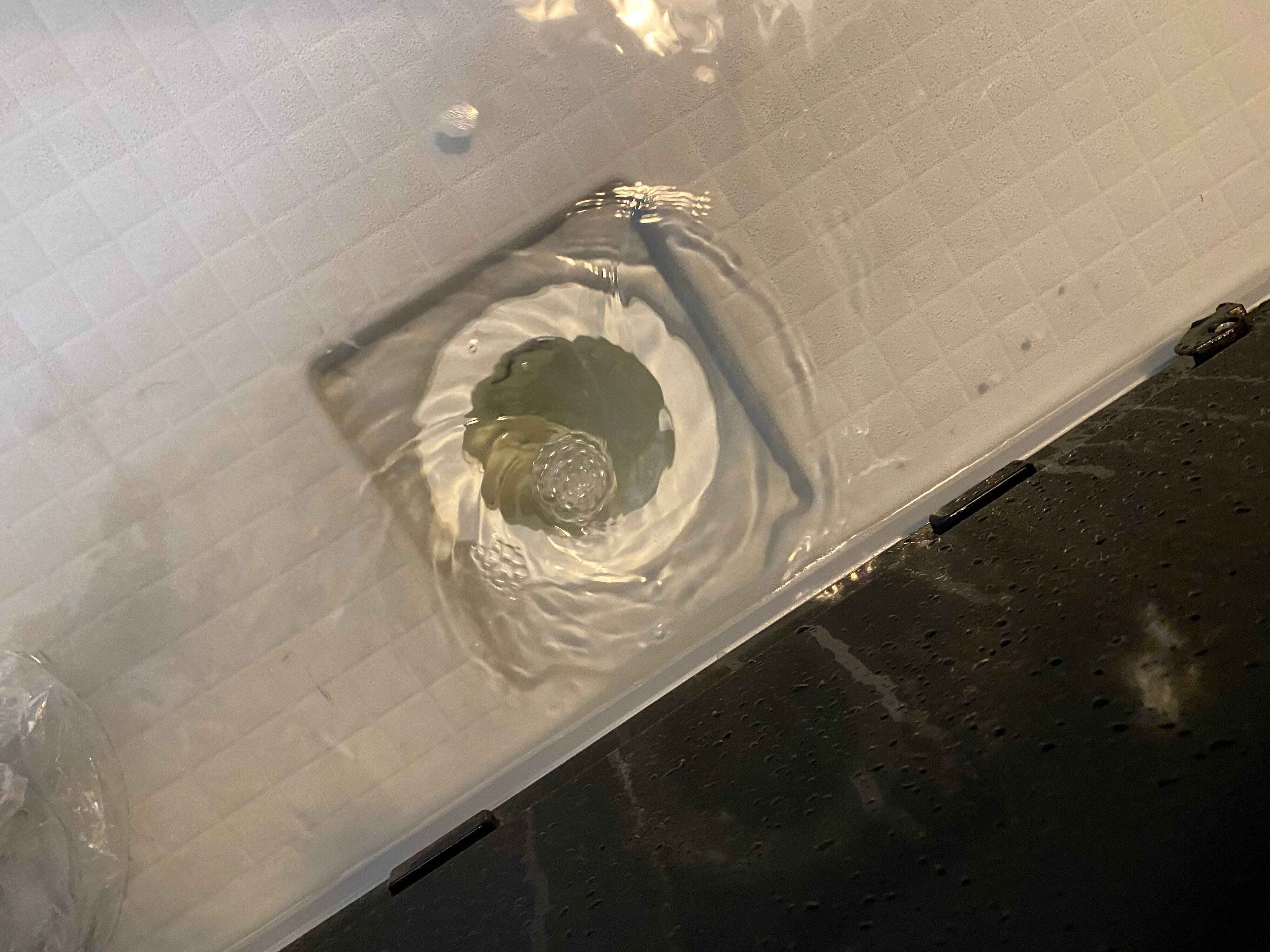 ヘアキャッチャーのポリ袋を外し、溜めていたお湯を流します。