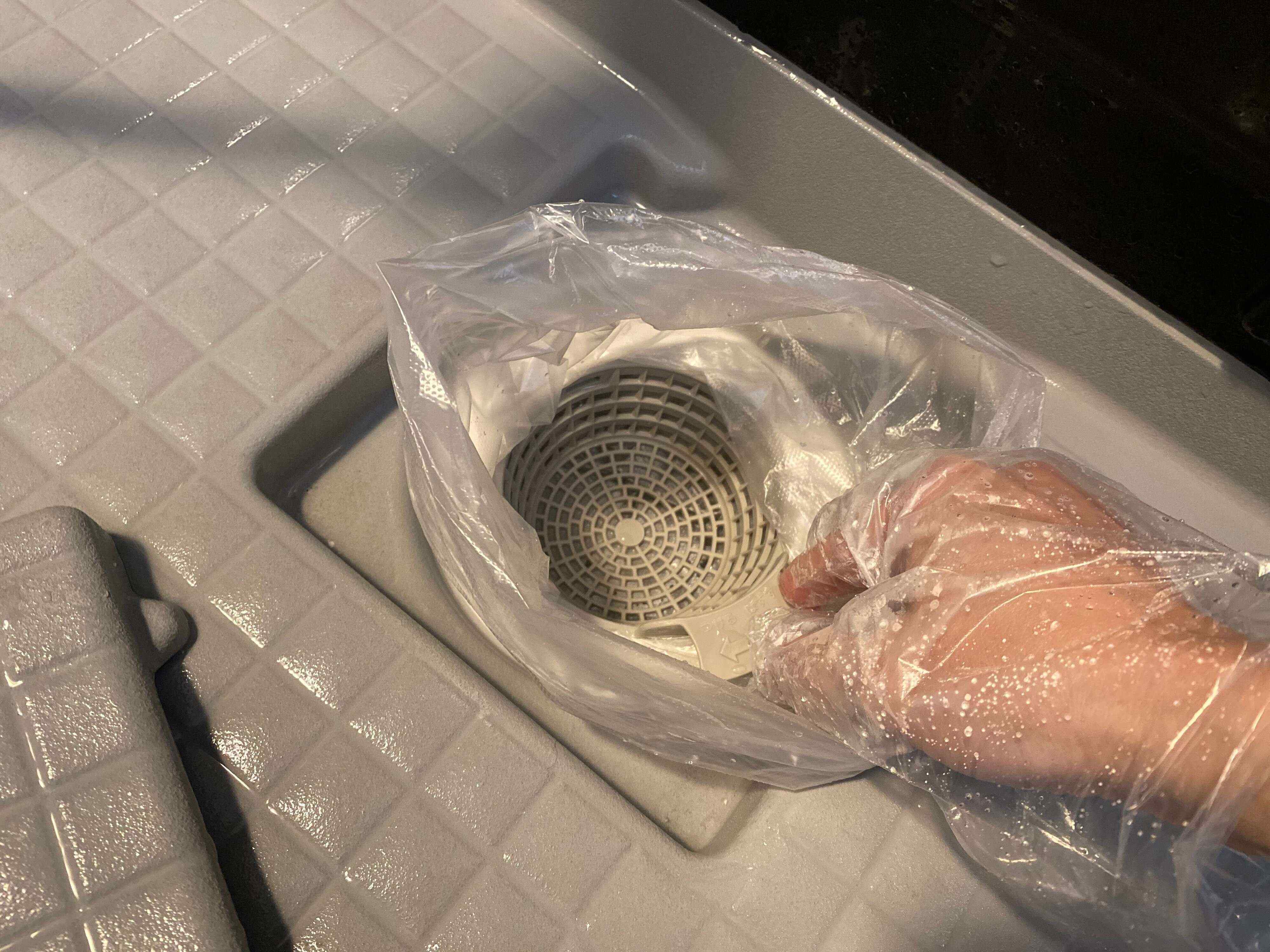 排水口のヘアキャッチャー(網目状のもの)は左に回すと外れるので、ヘアキャッチャーを外してポリ袋に入れて、右へ回しロックします。