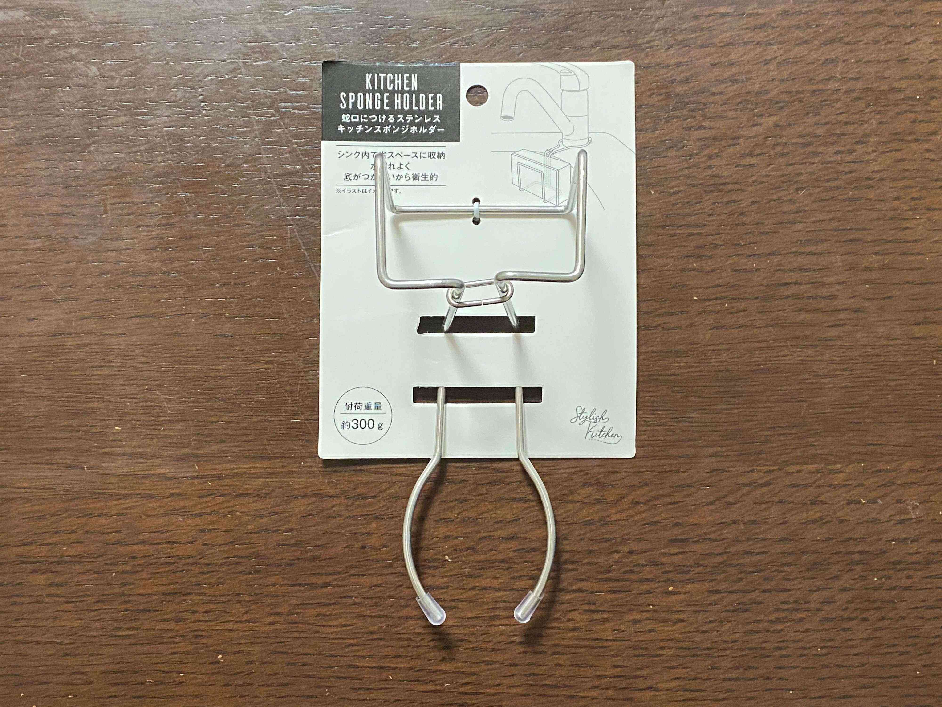 セリアの「蛇口につけるステンレス キッチンスポンジホルダー 100円」です。