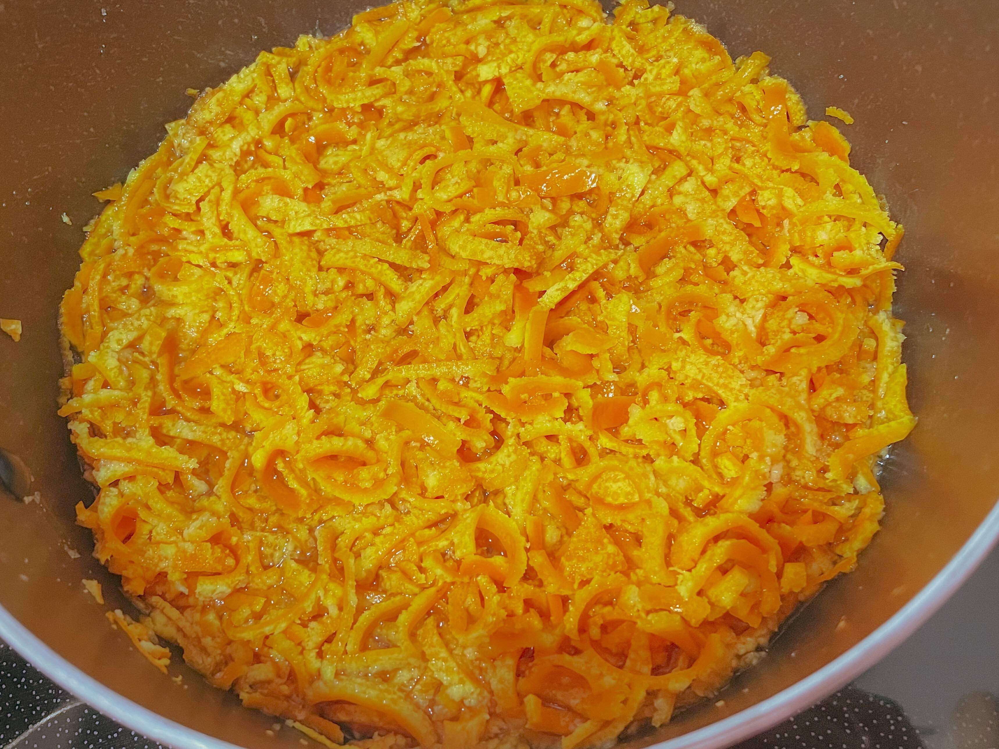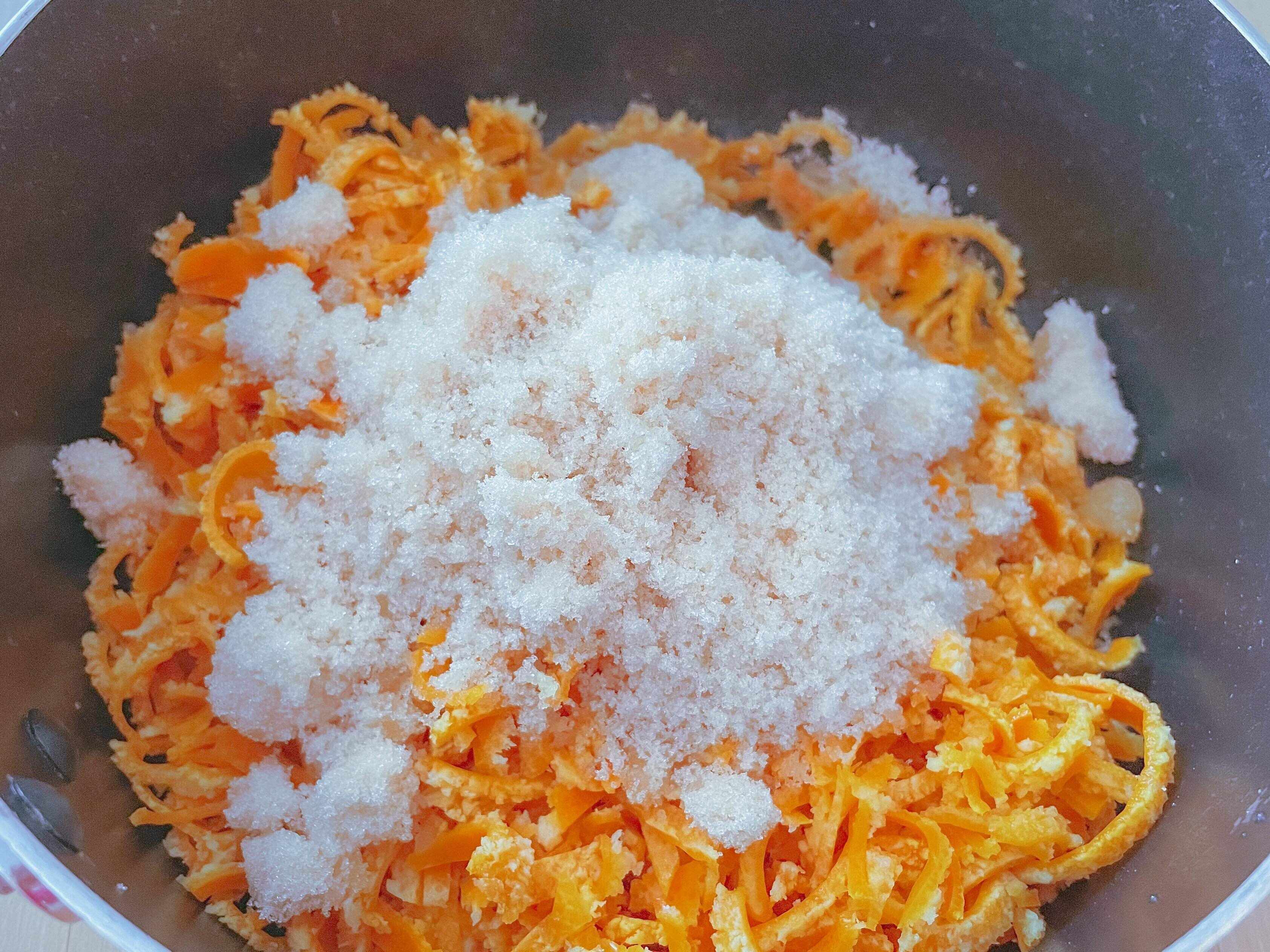 (4) 水を切り、皮と砂糖を鍋に入れ弱火にかける。