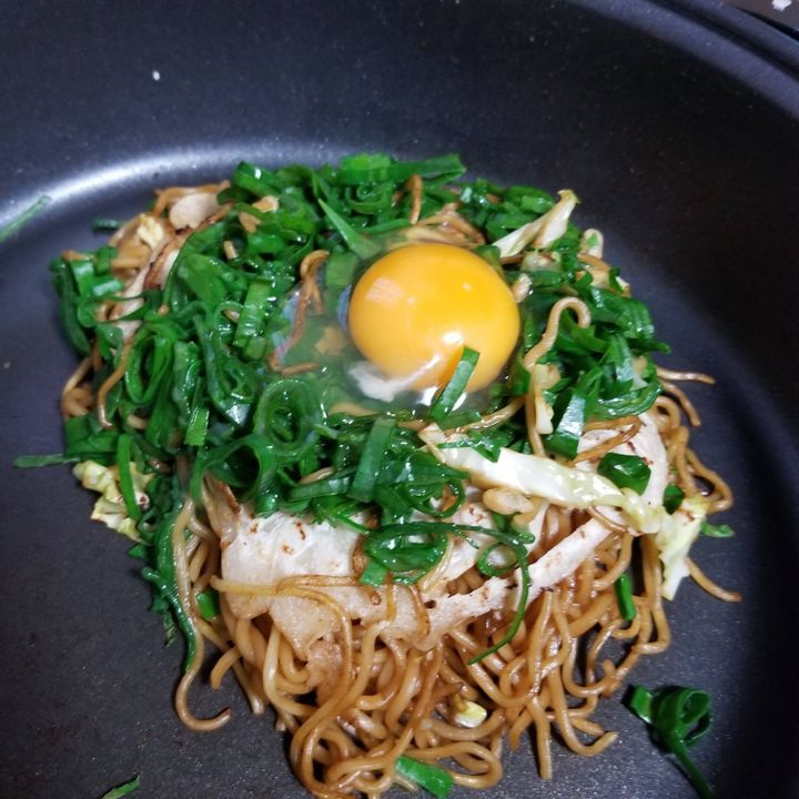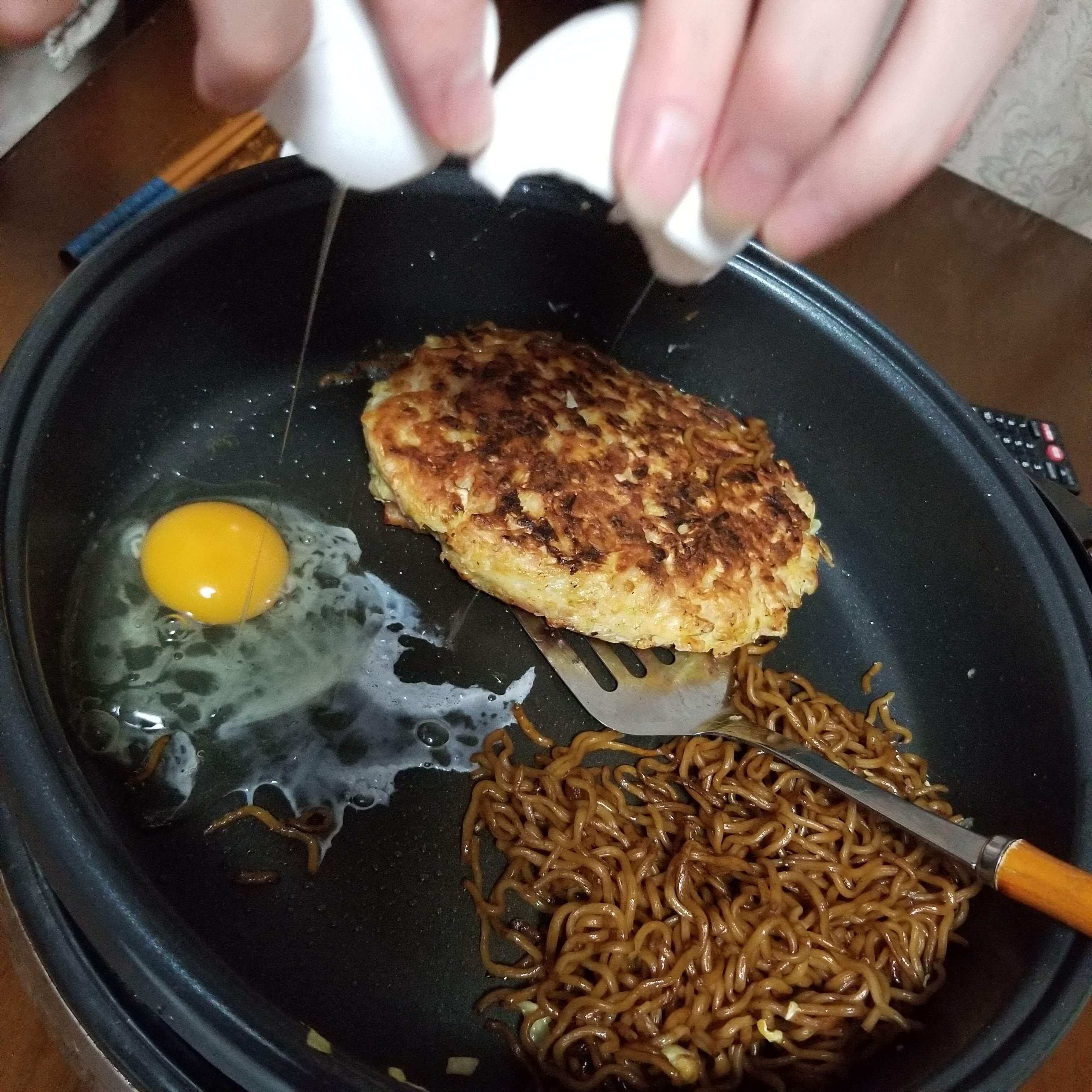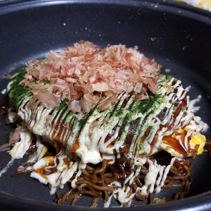 アレンジでキムチを入れたりしますが、基本的にお好み焼きが焼きあがったあとには、卵を崩して上にお好み焼きを乗せ、卵が好みの焼き具合になったら焼きそばの上に乗せていただきます。