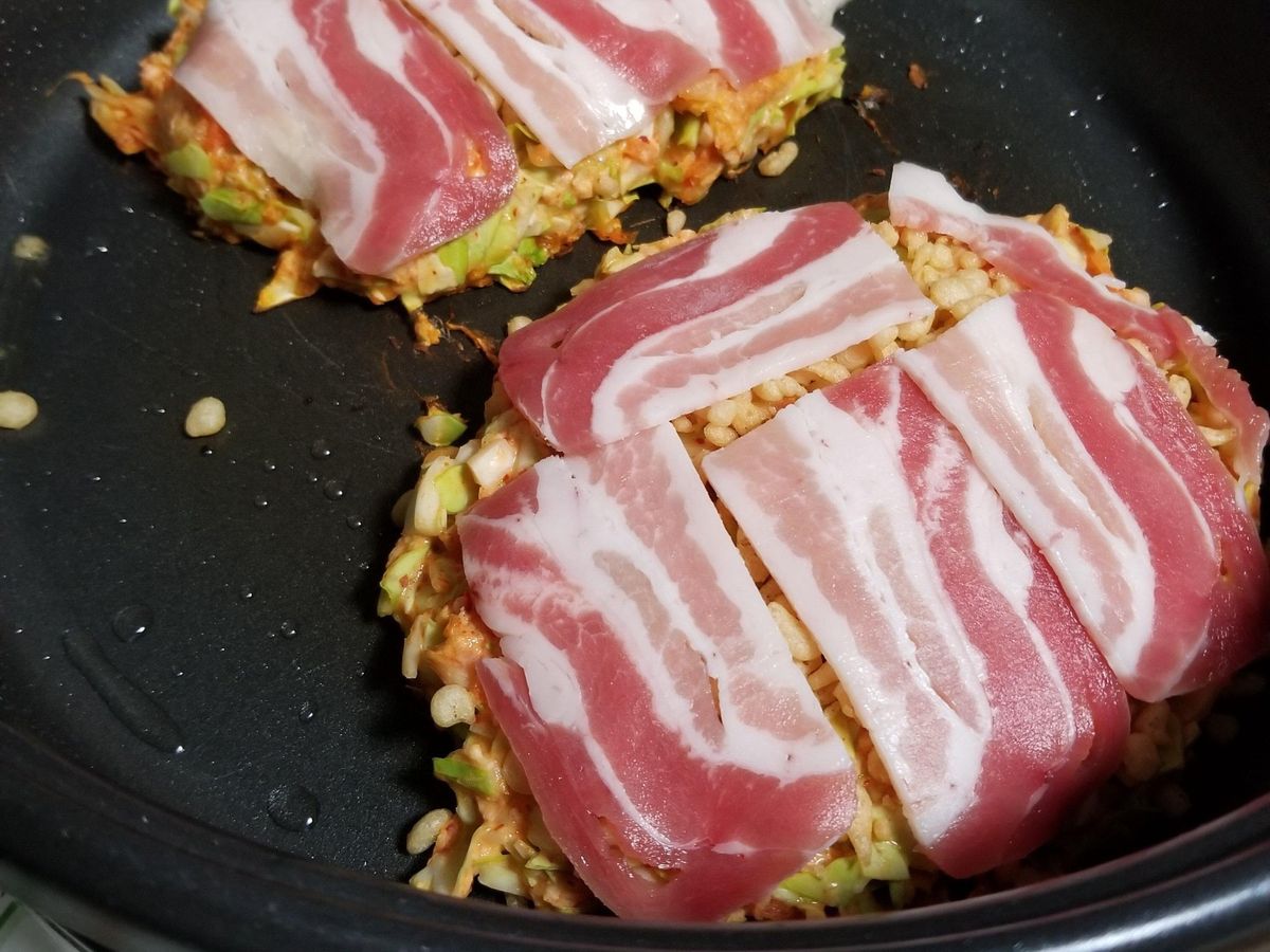 京都旅行に行ってからは、お好み焼きではちょっと重いという日は、薄く伸ばした生地に具材を乗せるまんぼ焼きにしています。