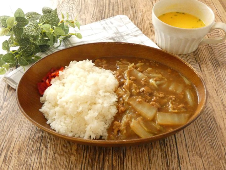 じゃが芋や人参、玉葱の代わりに白菜を使ったカレー。白菜4枚とひき肉200gでボリュームたっぷりになります。