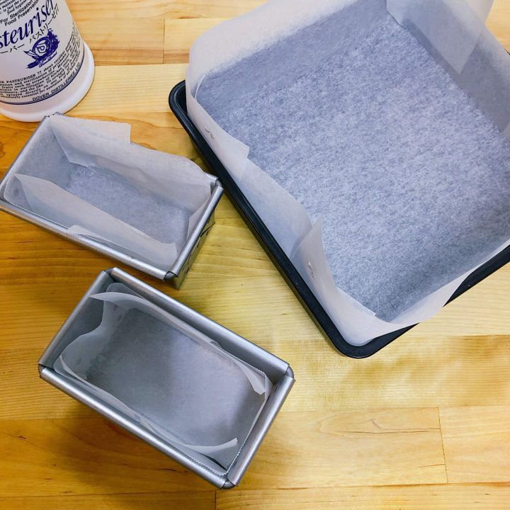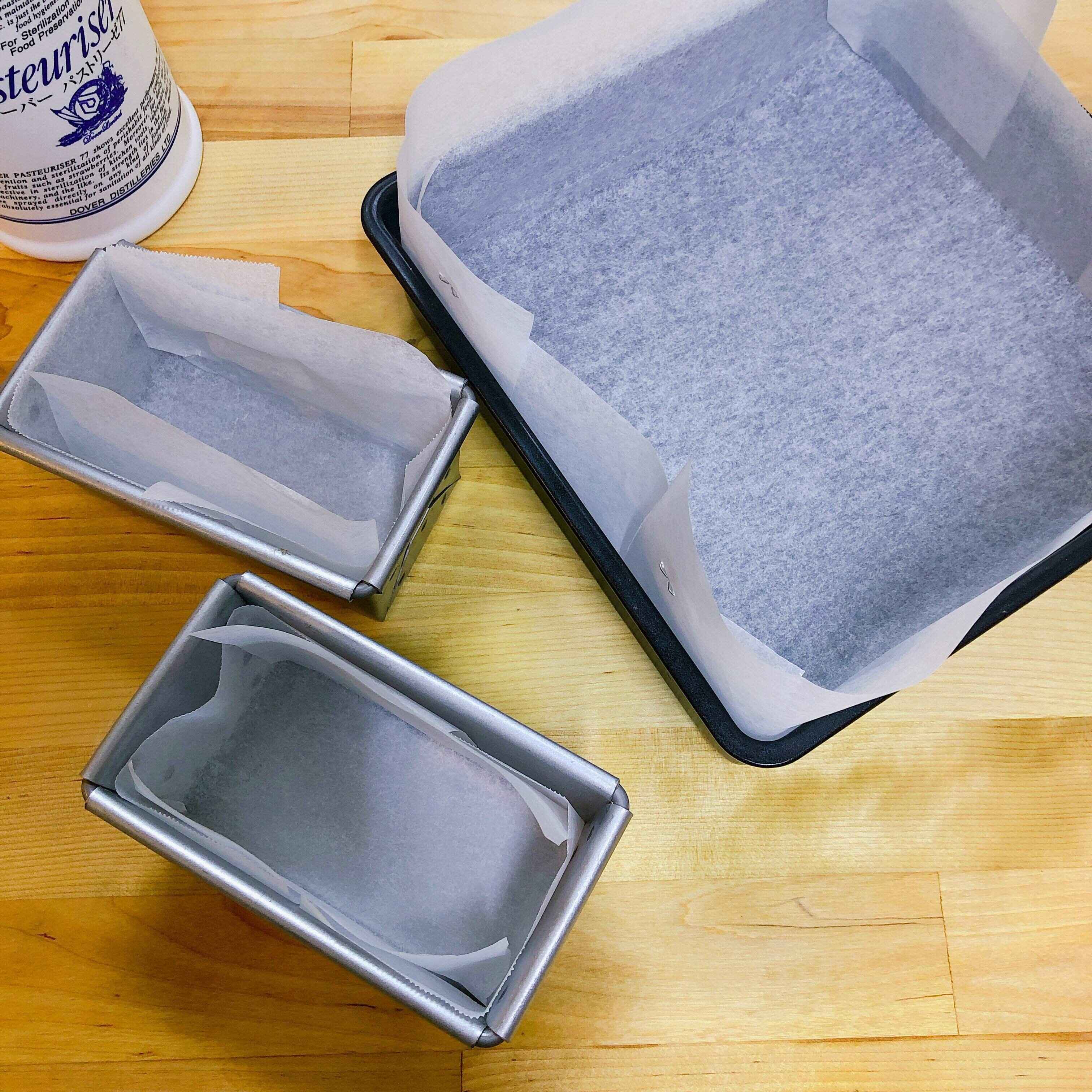 ⑵ 型にクッキングシートを敷きます (今回は18センチの正方形の型)。