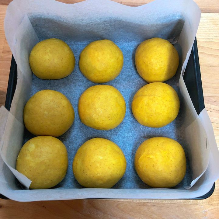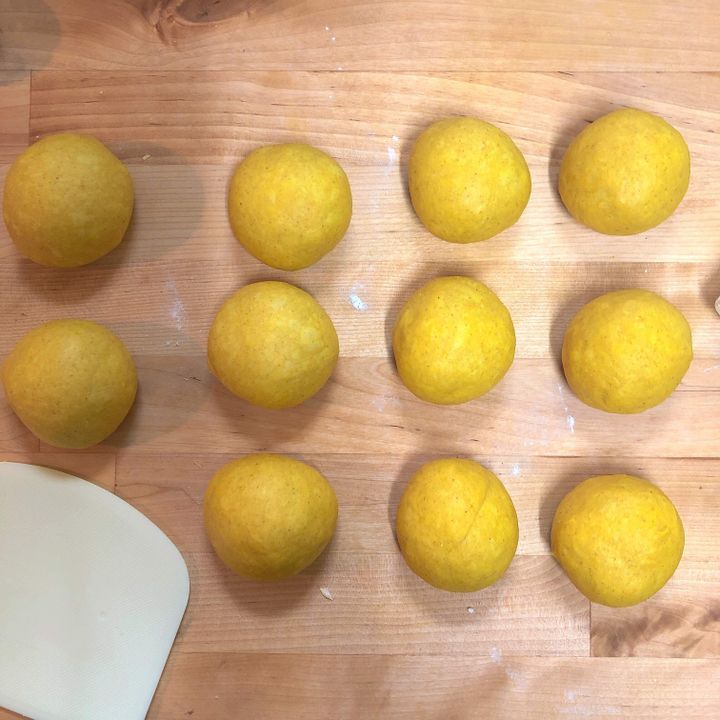 ⑶ 型の大きさに合わせて生地を等分して、丸めて濡れふきんをかけてベンチタイム15分。