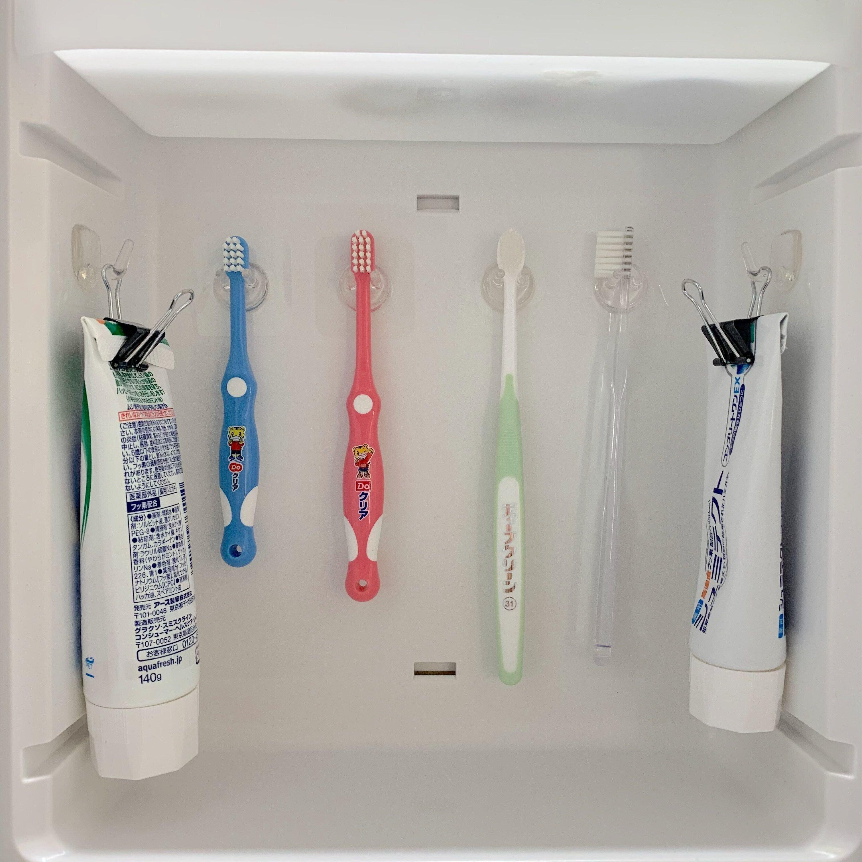 歯ブラシと歯磨きはフックを使って浮かせました。引っかけるだけなので、子どもたちも使いやすそうです。浮かせたことで、水分が溜まらず下の部分もほとんど汚れません。スタンドタイプの歯ブラシ収納よりも清潔だと感じています。
